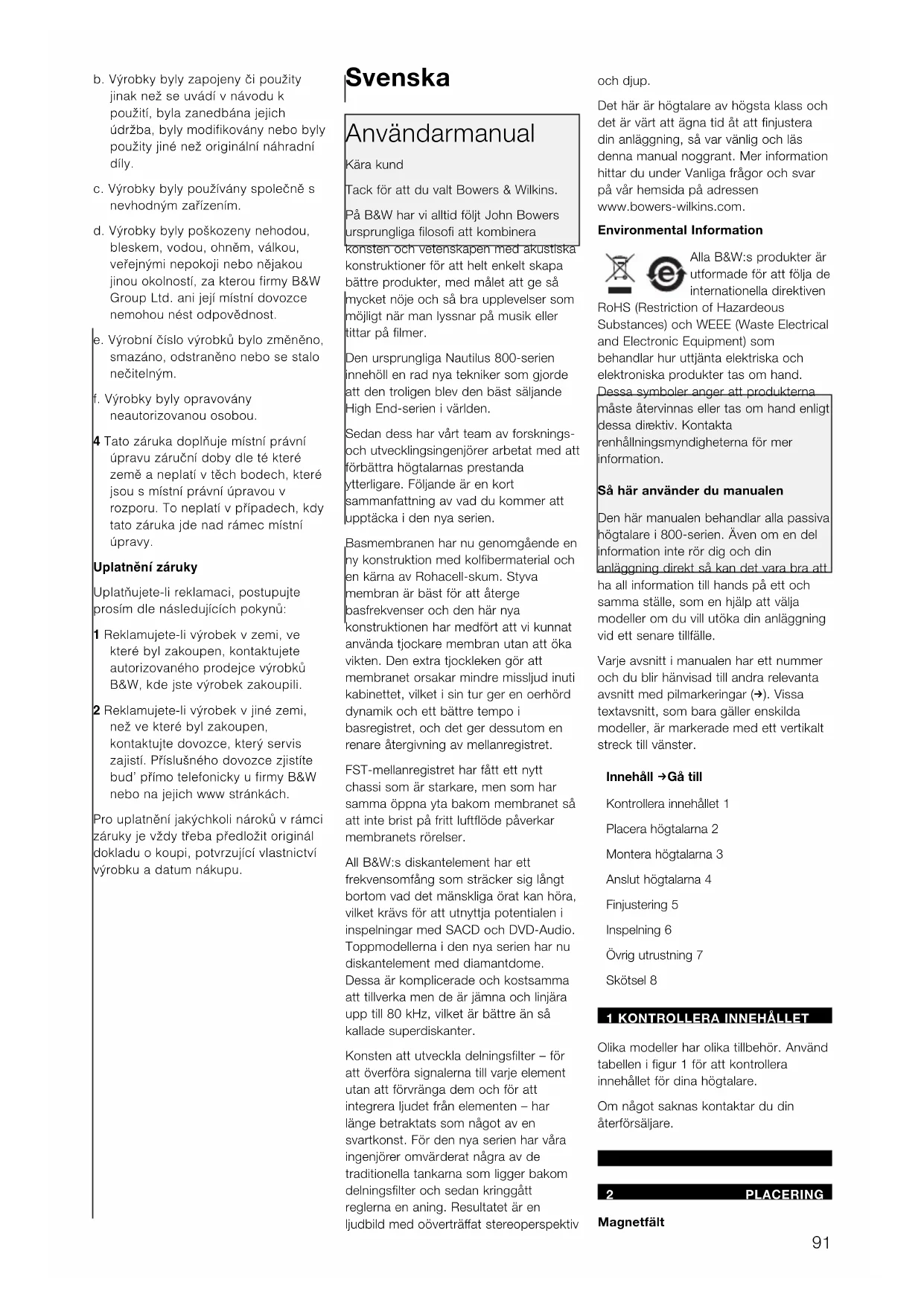 Záruka se vztahuje pouze na opravy v≥robkÅ. Nepokr≥vá p_epravu reklamovaného v≥robku do servisního st_ediska, manipulaci s ním a ani ãádná rizika z p_epravy a manipulace plynoucí. 2 Záruka platí pouze pro prvního kupce, kter≥ v≥robek koupil jako koncov≥ spot_ebitel a p_i dal|ím prodeji se jiã nep_ená|í. 3 Práva vypl≥vající ze záruky nebudou uznána v p_ípad> jin≥ch závad neã závad materiálu a dílenského zpracování a dále zejména v t>chto p_ípadech: a. V≥robky byly |patn> nainstalovány, zapojeny nebo |patn> uskladn>ny #i zabaleny.91 b. V≥robky byly zapojeny #i pouãity jinak neã se uvádí v návodu k pouãití, byla zanedbána jejich údrãba, byly modifikovány nebo byly pouãity jiné neã originální náhradní díly. c. V≥robky byly pouãívány spole#n> s nevhodn≥m za_ízením. d. V≥robky byly po|kozeny nehodou, bleskem, vodou, ohn>m, válkou, ve_ejn≥mi nepokoji nebo n>jakou jinou okolností, za kterou firmy B&W Group Ltd. ani její místní dovozce nemohou nést odpov>dnost. e. V≥robní #íslo v≥robkÅ bylo zm>n>no, smazáno, odstran>no nebo se stalo ne#iteln≥m. f. V≥robky byly opravovány neautorizovanou osobou. 4 Tato záruka dopl[uje místní právní úpravu záru#ní doby dle té které zem> a neplatí v t>ch bodech, které jsou s místní právní úpravou v rozporu. To neplatí v p_ípadech, kdy tato záruka jde nad rámec místní úpravy. Uplatn>ní záruky Uplat[ujete-li reklamaci, postupujte prosím dle následujících pokynÅ: 1 Reklamujete-li v≥robek v zemi, ve které byl zakoupen, kontaktujete autorizovaného prodejce v≥robkÅ B&W, kde jste v≥robek zakoupili. 2 Reklamujete-li v≥robek v jiné zemi, neã ve které byl zakoupen, kontaktujte dovozce, kter≥ servis zajistí. P_íslu|ného dovozce zjistíte bud’ p_ímo telefonicky u firmy B&W nebo na jejich www stránkách. Pro uplatn>ní jak≥chkoli nárokÅ v rámci záruky je vãdy t_eba p_edloãit originál dokladu o koupi, potvrzující vlastnictví v≥robku a datum nákupu. Svenska Användarmanual Kära kund Tack för att du valt Bowers & Wilkins. På B&W har vi alltid följt John Bowers ursprungliga filosofi att kombinera konsten och vetenskapen med akustiska konstruktioner för att helt enkelt skapa bättre produkter, med målet att ge så mycket nöje och så bra upplevelser som möjligt när man lyssnar på musik eller tittar på filmer. Den ursprungliga Nautilus 800-serien innehöll en rad nya tekniker som gjorde att den troligen blev den bäst säljande High End-serien i världen. Sedan dess har vårt team av forsknings- och utvecklingsingenjörer arbetat med att förbättra högtalarnas prestanda ytterligare. Följande är en kort sammanfattning av vad du kommer att upptäcka i den nya serien. Basmembranen har nu genomgående en ny konstruktion med kolfibermaterial och en kärna av Rohacell-skum. Styva membran är bäst för att återge basfrekvenser och den här nya konstruktionen har medfört att vi kunnat använda tjockare membran utan att öka vikten. Den extra tjockleken gör att membranet orsakar mindre missljud inuti kabinettet, vilket i sin tur ger en oerhörd dynamik och ett bättre tempo i basregistret, och det ger dessutom en renare återgivning av mellanregistret. FST-mellanregistret har fått ett nytt chassi som är starkare, men som har samma öppna yta bakom membranet så att inte brist på fritt luftflöde påverkar membranets rörelser. All B&W:s diskantelement har ett frekvensomfång som sträcker sig långt bortom vad det mänskliga örat kan höra, vilket krävs för att utnyttja potentialen i inspelningar med SACD och DVD-Audio. Toppmodellerna i den nya serien har nu diskantelement med diamantdome. Dessa är komplicerade och kostsamma att tillverka men de är jämna och linjära upp till 80 kHz, vilket är bättre än så kallade superdiskanter. Konsten att utveckla delningsfilter – för att överföra signalerna till varje element utan att förvränga dem och för att integrera ljudet från elementen – har länge betraktats som något av en svartkonst. För den nya serien har våra ingenjör er omvär derat några av de traditionella tankar na som ligger bakom delningsfilter och sedan kringgått reglerna en aning. Resultatet är en ljudbild med oöverträf fat stereoperspektiv och djup. Det här är högtalare av högsta klass och det är värt att ägna tid åt att finjustera din anläggning, så var vänlig och läs denna manual noggrant. Mer information hittar du under Vanliga frågor och svar på vår hemsida på adressen www.bowers-wilkins.com. Environmental Information Alla B&W:s produkter är utformade för att följa de internationella direktiven RoHS (Restriction of Hazardeous Substances) och WEEE (Waste Electrical and Electronic Equipment) som behandlar hur uttjänta elektriska och elektroniska produkter tas om hand. Dessa symboler anger att produkterna måste återvinnas eller tas om hand enligt dessa dir ektiv. Kontakta renhållningsmyndigheterna för mer information. Så här använder du manualen Den här manualen behandlar alla passiva högtalare i 800-serien. Även om en del information inte rör dig och din anläggning direkt så kan det vara bra att ha all information till hands på ett och samma ställe, som en hjälp att välja modeller om du vill utöka din anläggning vid ett senare tillfälle. Varje avsnitt i manualen har ett nummer och du blir hänvisad till andra relevanta avsnitt med pilmarkeringar ( f). Vissa textavsnitt, som bara gäller enskilda modeller, är markerade med ett vertikalt streck till vänster. Innehåll f Gå till Kontrollera innehållet 1 Placera högtalarna 2 Montera högtalarna 3 Anslut högtalarna 4 Finjustering 5 Inspelning 6 Övrig utrustning 7 Skötsel 8