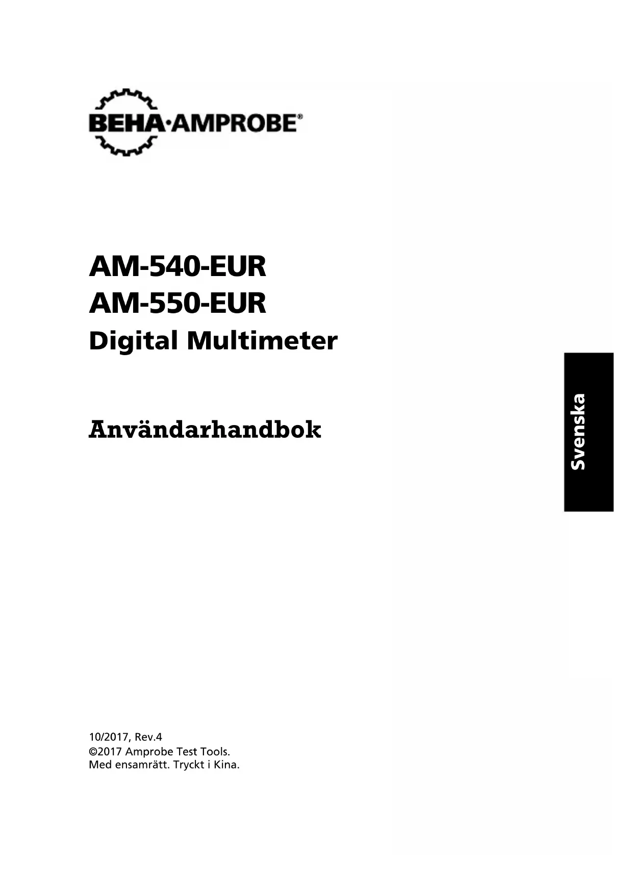 9V battery F2Svenska AM-540-EUR AM-550-EUR Digital Multimeter Användarhandbok 10/2017, Rev.4 ©2017 Amprobe Test Tools. Med ensamrätt. Tryckt i Kina.Begränsad garanti och ansvarsbegränsning Denna Amprobe-produkt garanteras vara fri från felaktigheter i material och utförande i ett år från inköpsdatum om detta inte avviker från lokal lagstiftning. Denna garanti innefattar inte säkringar och engångsbatterier, och inte heller skador som uppkommer som en följd av olyckshändelser, försummelse, felaktig användning, ändring, förorening eller onormala förhållanden eller onormal hantering. Återförsäljare har inte rätt att lämna några ytterligare garantier å Amprobes vägnar. Om du behöver service under garantiperioden ska produkten, tillsammans med inköpsbevis, skickas in till ett auktoriserat Amprobe Service Center eller till en återförsäljare eller distributör för Amprobe. Avsnittet Reparation innehåller uppgifter om detta. DENNA GARANTI UTGÖR DIN ENDA GOTTGÖRELSE. ALLA ANDRA GARANTIER – VARE SIG DESSA ÄR UTTRYCKLIGA, UNDERFÖRSTÅDDA ELLER LAGSTADGADE – INKLUSIVE UNDERFÖRSTÅDDA GARANTIER AVSEENDE LÄMPLIGHETEN FÖR ETT VISST SYFTE ELLER SÄLJBARHET, DEMENTERAS HÄRMED. TILLVERKAREN ÄR EJ ANSVARIG FÖR NÅGRA SÄRSKILDA SKADOR, INDIREKTA SKADOR, OFÖRUTSEDDA SKADOR ELLER FÖLJDSKADOR ELLER FÖRLUSTER, SOM UPPSTÅR PÅ GRUND AV NÅGON ORSAK ELLER TEORI. Vissa stater eller länder tillåter inte undantag eller begränsningar av underförstådda garantier eller tillfälliga skador eller följdskador, så denna ansvarsbegränsning gäller eventuellt inte dig. Reparation Alla mätverktyg som returneras för garantireparation eller reparation utanför garantin eller för kalibrering ska åtföljas av följande: ditt namn, företagets namn, adress, telefonnummer och inköpsbevis. Inkludera dessutom en kort beskrivning av problemet eller den begärda servicen och skicka också in mätsladdarna tillsammans med mätaren. Betalning för reparation eller utbytesdelar som ej faller under garantin ska ske med check, postanvisning, kreditkort med utgångsdatum eller en inköpsorder med betalningsmottagare Amprobe®. Reparationer och utbyten under garanti – Alla länder Läs garantiuttalandet och kontrollera batteriet innan du begär reparation. Defekta mätverktyg kan under garantiperioden returneras till din Amprobe® -distributör för utbyte mot samma eller liknande produkt. Avsnittet "Where to Buy" på www.amprobe.com innehåller en lista över distributörer i närheten av dig. Om du befinner dig i USA eller Kanada och din enhet täcks av garanti kan du få den reparerad eller utbytt genom att skicka in den till ett Amprobe® Service Center (se nedanstående adresser). Reparationer och utbyten ej under garanti – USA och Kanada Enheter som kräver reparation, men som ej täcks av garanti i USA och Kanada, ska skickas till ett Amprobe® Service Center. Ring till Amprobe® eller kontakta inköpsstället för att få uppgifter om aktuella kostnader för reparation och utbyte. I USA I Kanada Amprobe Amprobe Everett, WA 98203 Mississauga, ON L4Z 1X9 Tel: 877-AMPROBE (267-7623) Tel: 905-890-7600 Reparationer och utbyten ej under garanti – Europa Enheter i Europa, som ej täcks av garanti, kan bytas ut av din Amprobe® -distributör för en nominell kostnad. Avsnittet "Where to Buy" på www.amprobe.com innehåller en lista över distributörer i närheten av dig. Adress för korrespondens i Europa* Amprobe® Europe Beha-Amprobe GmbH In den Engematten 14 79286 Glottertal, Tyskland Tel: +49 (0) 7684 8009 - 0 www.amprobe.eu *(Endast korrespondens – inga reparationer eller utbyten är tillgängliga från denna adress. Kunder i Europa ska kontakta respektive distributör.)AM-540-EUR / AM-550-EUR Digital Multimeter