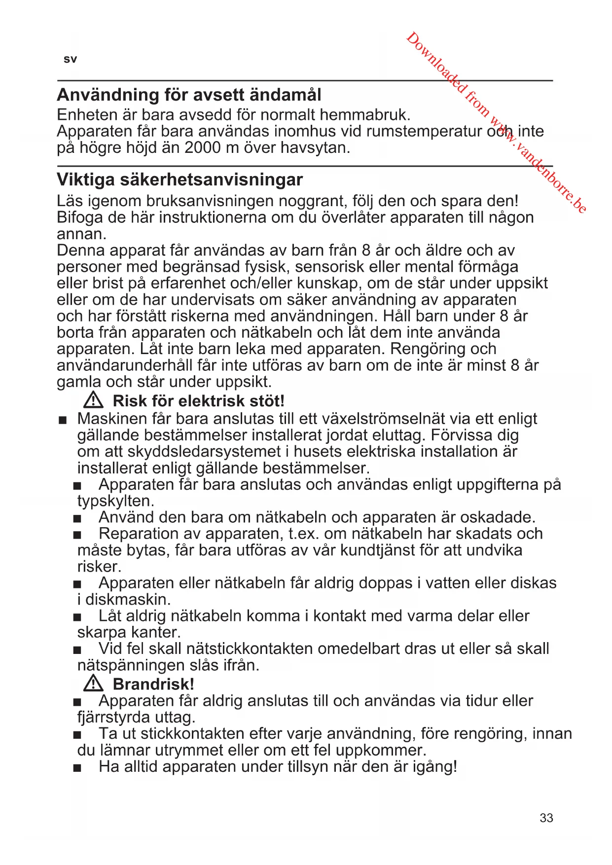 Användning för avsett ändamål Enheten är bara avsedd för normalt hemmabruk. Apparaten får bara användas inomhus vid rumstemperatur och inte på högre höjd än 2000 m över havsytan. Viktiga säkerhetsanvisningar Läs igenom bruksanvisningen noggrant, följ den och spara den! Bifoga de här instruktionerna om du överlåter apparaten till någon annan. Denna apparat får användas av barn från 8 år och äldre och av personer med begränsad fysisk, sensorisk eller mental förmåga eller brist på erfarenhet och/eller kunskap, om de står under uppsikt eller om de har undervisats om säker användning av apparaten och har förstått riskerna med användningen. Håll barn under 8 år borta från apparaten och nätkabeln och låt dem inte använda apparaten. Låt inte barn leka med apparaten. Rengöring och användarunderhåll får inte utföras av barn om de inte är minst 8 år gamla och står under uppsikt. W Risk för elektrisk stöt! ■ Maskinen får bara anslutas till ett växelströmselnät via ett enligt gällande bestämmelser installerat jordat eluttag. Förvissa dig om att skyddsledarsystemet i husets elektriska installation är installerat enligt gällande bestämmelser. ■ Apparaten får bara anslutas och användas enligt uppgifterna på typskylten. ■ Använd den bara om nätkabeln och apparaten är oskadade. ■ Reparation av apparaten, t.ex. om nätkabeln har skadats och måste bytas, får bara utföras av vår kundtjänst för att undvika risker. ■ Apparaten eller nätkabeln får aldrig doppas i vatten eller diskas i diskmaskin. ■ Låt aldrig nätkabeln komma i kontakt med varma delar eller skarpa kanter. ■ Vid fel skall nätstickkontakten omedelbart dras ut eller så skall nätspänningen slås ifrån. W Brandrisk! ■ Apparaten får aldrig anslutas till och användas via tidur eller fjärrstyrda uttag. ■ Ta ut stickkontakten efter varje användning, före rengöring, innan du lämnar utrymmet eller om ett fel uppkommer. ■ Ha alltid apparaten under tillsyn när den är igång! Downloaded from www.vandenborre.be34