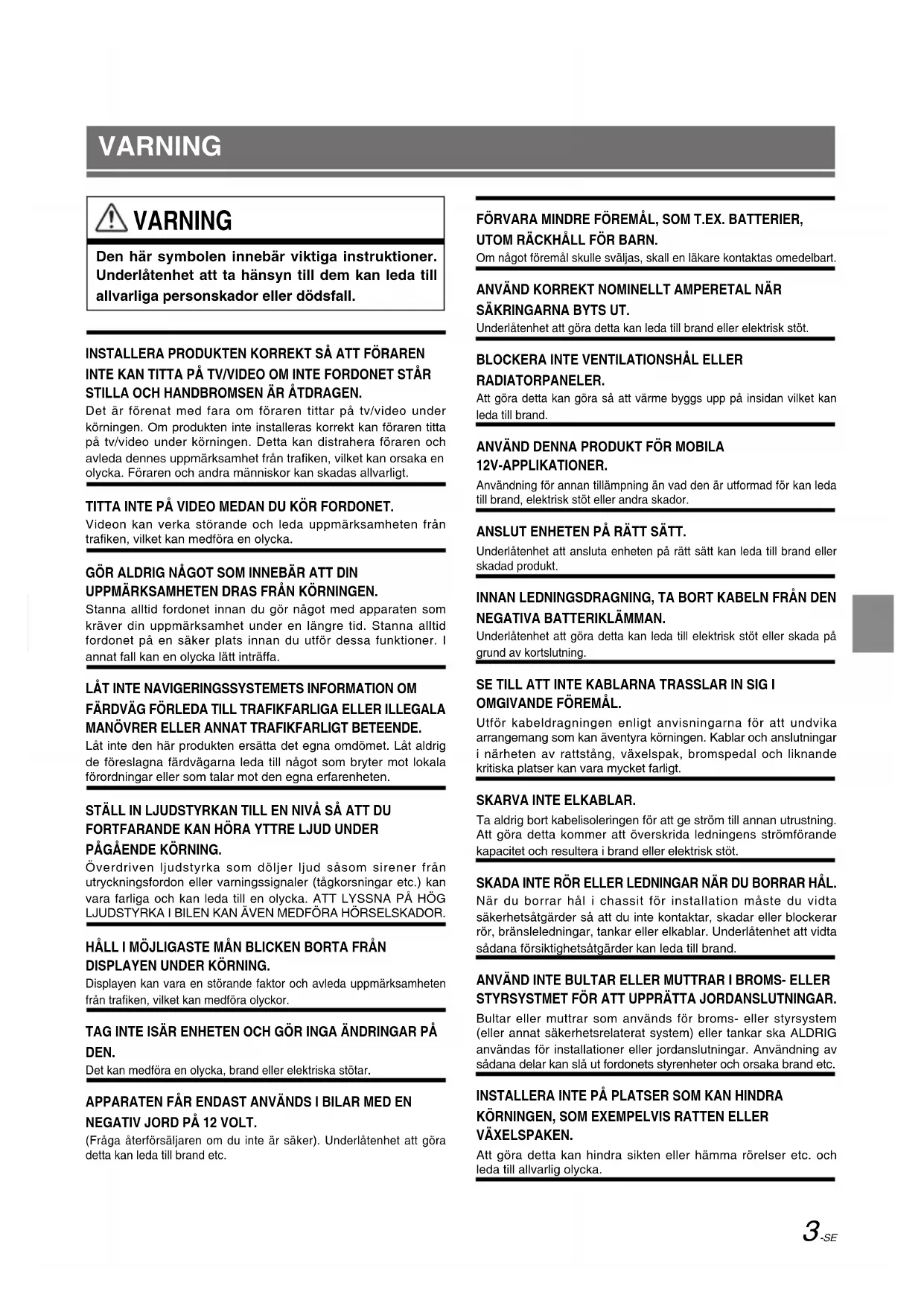 -SE VARNING VARNING Den här symbolen innebär viktiga instruktioner. Underlåtenhet att ta hänsyn till dem kan leda till allvarliga personskador eller dödsfall. INSTALLERA PRODUKTEN KORREKT SÅ ATT FÖRAREN INTE KAN TITTA PÅ TV/VIDEO OM INTE FORDONET STÅR STILLA OCH HANDBROMSEN ÄR ÅTDRAGEN. Det är förenat med fara om föraren tittar på tv/video under körningen. Om produkten inte installeras korrekt kan föraren titta på tv/video under körningen. Detta kan distrahera föraren och avleda dennes uppmärksamhet från traken, vilket kan orsaka en olycka. Föraren och andra människor kan skadas allvarligt. TITTA INTE PÅ VIDEO MEDAN DU KÖR FORDONET. Videon kan verka störande och leda uppmärksamheten från traken, vilket kan medföra en olycka. GÖR ALDRIG NÅGOT SOM INNEBÄR ATT DIN UPPMÄRKSAMHETEN DRAS FRÅN KÖRNINGEN. Stanna alltid fordonet innan du gör något med apparaten som kräver din uppmärksamhet under en längre tid. Stanna alltid fordonet på en säker plats innan du utför dessa funktioner. I annat fall kan en olycka lätt inträffa.