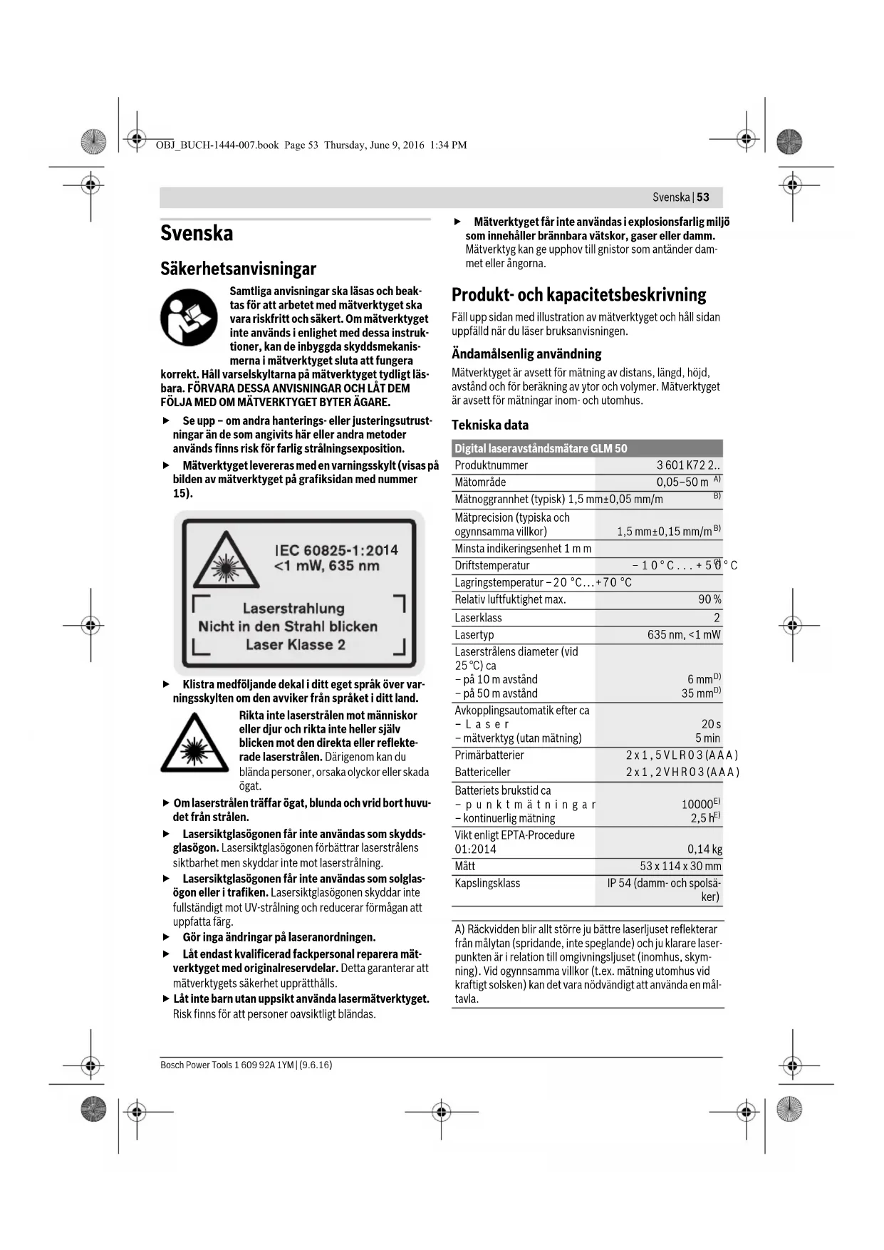 Inddel beregning i mel- lemskridt Måleresultat ikke plausibelt Målflade reflekterer ikke entydigt (f.eks. vand, glas). Afdæk målflade Udgang laserstråling 11 eller mod- tagerlinse 12 er tildækket. Hold udgang lasestråling 11 eller modtagerlinse 12 fri Forkert referenceniveau indstillet Vælg referenceniveau, så det passer til måling Forhindring i laserstrålens forløb Laserpunkt skal ligge komplet på målflade. Visningen forbliver uændret, eller måleværktøjet reage- rer uventet på tastetryk Fejl i softwaren Tag batterierne ud og læg dem i igen, før måle- værktøjet startes igen. OBJ_BUCH-1444-007.book Page 52 Thursday, June 9, 2016 1:34 PMSvenska | 53 Bosch Power Tools 1 609 92A 1YM | (9.6.16) Svenska Säkerhetsanvisningar Samtliga anvisningar ska läsas och beak- tas för att arbetet med mätverktyget ska vara riskfritt och säkert. Om mätverktyget inte används i enlighet med dessa instruk- tioner, kan de inbyggda skyddsmekanis- merna i mätverktyget sluta att fungera korrekt. Håll varselskyltarna på mätverktyget tydligt läs- bara. FÖRVARA DESSA ANVISNINGAR OCH LÅT DEM FÖLJA MED OM MÄTVERKTYGET BYTER ÄGARE. Se upp – om andra hanterings- eller justeringsutrust- ningar än de som angivits här eller andra metoder används finns risk för farlig strålningsexposition. Mätverktyget levereras med en varningsskylt (visas på bilden av mätverktyget på grafiksidan med nummer 15). Klistra medföljande dekal i ditt eget språk över var- ningsskylten om den avviker från språket i ditt land. Rikta inte laserstrålen mot människor eller djur och rikta inte heller själv blicken mot den direkta eller reflekte- rade laserstrålen. Därigenom kan du blända personer, orsaka olyckor eller skada ögat. Om laserstrålen träffar ögat, blunda och vrid bort huvu- det från strålen. Lasersiktglasögonen får inte användas som skydds- glasögon. Lasersiktglasögonen förbättrar laserstrålens siktbarhet men skyddar inte mot laserstrålning. Lasersiktglasögonen får inte användas som solglas- ögon eller i trafiken. Lasersiktglasögonen skyddar inte fullständigt mot UV-strålning och reducerar förmågan att uppfatta färg. Gör inga ändringar på laseranordningen. Låt endast kvalificerad fackpersonal reparera mät- verktyget med originalreservdelar. Detta garanterar att mätverktygets säkerhet upprätthålls. Låt inte barn utan uppsikt använda lasermätverktyget. Risk finns för att personer oavsiktligt bländas. Mätverktyget får inte användas i explosionsfarlig miljö som innehåller brännbara vätskor, gaser eller damm. Mätverktyg kan ge upphov till gnistor som antänder dam- met eller ångorna. Produkt- och kapacitetsbeskrivning Fäll upp sidan med illustration av mätverktyget och håll sidan uppfälld när du läser bruksanvisningen. Ändamålsenlig användning Mätverktyget är avsett för mätning av distans, längd, höjd, avstånd och för beräkning av ytor och volymer. Mätverktyget är avsett för mätningar inom- och utomhus. Tekniska data