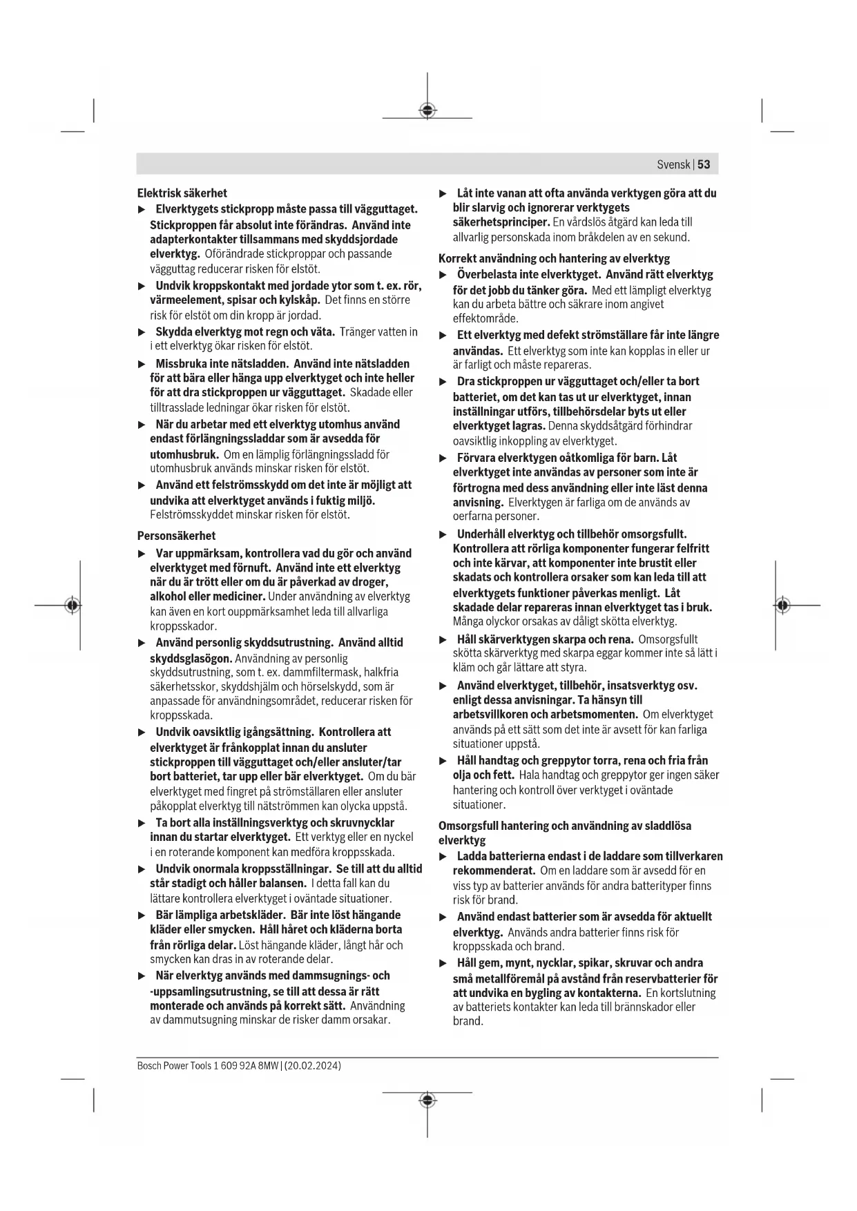 Lägg slippappret spänt över slipplattan (3). Kläm fast den främre delen av slipbladet under den främre klämlisten (7). Se till att slipbladet (6) inte är för kort Bosch Power Tools 1 609 92A 8MW | (20.02.2024)56 | Svensk och kläms fast korrekt. Sväng tillbaka plintbygeln (4) till utgångsläget och lås den där. Ohålade slipblad från t.ex. rull- och metervara kan du håla med hålverktyget (17) för dammsugningen. För att göra det trycker du på elverktyget med monterat slipblad på hålverktyget (se bild F). För att ta av slipbladet (6) lossar du båda plintbyglar (4) och drar ut slipbladet ur sin hållare. Val av slipblad Olika slipblad finns tillgängliga beroende på vilket material som används och önskad avverkning: Kornstorlek För bearbetning av samtliga trämaterial 40 – 180 För förslipning, t.ex. av obearbetade, ohyvlade balkar och brädor grov 40 För planslipning och utjämning av mindre ojämnheter medel 80, 120 För slut- och finslipning av hårt trä fin 180 För bearbetning av färg- och lackskikt resp. grundning som fyllning och spackel 40 – 180 För avslipning av färg grov 40 För slipning av grundfärg medel 80, 120 För slutslipning av grundfärg innan lackering fin 180 För efterbearbetning resp. polering, särskilt av metall och sten, använd filt/poleringsfilt. Beroende på önskad yta på arbetsstycket ska olika filttyper resp. poleringsfilter användas. Damm-/spånutsugning Dammet från material som t.ex. blyhaltig målning, vissa träslag, mineraler och metall kan vara hälsovådligt. Beröring eller inandning av dammet kan orsaka allergiska reaktioner och/eller andningsbesvär hos användaren eller personer som uppehåller sig i närheten. Vissa damm från ek eller bok anses vara cancerogena, speciellt då i förbindelse med tillsatsämnen för träbehandling (kromat, träkonserveringsmedel). Endast yrkesmän får bearbeta asbesthaltigt material. – Använd om möjligt en för materialet lämplig dammutsugning. – Se till att arbetsplatsen är väl ventilerad. – Vi rekommenderar ett andningsskydd i filterklass P2. Beakta de föreskrifter som i aktuellt land gäller för bearbetat material. u Undvik dammanhopning på arbetsplatsen. Damm kan lätt självantändas. Eget utsug med dammbox (se bild E1–E4) Sätt dammboxen (1) på utblåsstutsen (15) tills den snäpper fast. För att tömma dammboxen (1), dra av den neråt. Innan stoftboxen (1) öppnas bör du knacka stoftboxen mot ett fast underlag för att lossa stoftet från filterelementet. Ta tag i handtaget på dammboxen (1), fäll filterelementet (16) uppåt och töm dammboxen. Rengör lamellerna på filterelementet (16) med en mjuk borste. Extern utsugning Sugen måste vara lämplig för det material som ska bearbetas. Använd en specialsug för att suga hälsovådligt och cancerframkallande eller torrt damm. Drift Driftstart In- och urkoppling u Se till att du kan manövrera på-/av-strömbrytaren utan att släppa handtaget. För att slå på elverktyget, skjut på-/av-knappen (8) åt höger till position ”I”. För att stänga av elverktyget, skjut på-/av-knappen (8) åt vänster till position ”O”. Indikering batteristatus De tre gröna LED-lamporna på batteristatusindikeringen (10) visar batteriets laddstatus (11). Avsäkerhetsskäl kan man endast kontrollera batteristatus när elverktyget är stilla. Tryck på knappen (9) för att visa laddningsnivå. Detta är möjligt även då batteriet (11) är uttaget. LED Kapacitet Fast ljus 3× grönt ≥66% Fast ljus 2× grönt ≥33% Fast ljus 1× grönt <33% Blinkande ljus 1× grön Reserv Om ingen LED-lampa lyser efter ett tryck på knappen (9) är batteriet defekt och måste bytas ut. Temperaturberoende överbelastningsskydd Elverktyget kan inte överbelastas om användning sker enligt föreskrifterna. Vid en alltför kraftig belastning eller överskridande av den tillåtna batteritemperaturen stänger elektroniken av elverktyget tills det har återgått till det optimala driftstemperaturområdet. Arbetsanvisningar u Ta ut batteriet ur elverktyget innan alla arbeten på det (t.ex.underhåll, verktygsbyte, osv.). Om strömbrytaren oavsiktligt påverkas finns risk för personskada. u Vänta tills elverktyget stannat helt innan du lägger bort det. 1 609 92A 8MW | (20.02.2024) Bosch Power ToolsNorsk | 57 Avverkning vid slipning beror i huvudsak på val av slipblad. Endast felfria slipblad ger en god slipeffekt och skonar samtidigt elverktyget. Ett jämnt anliggningstryck förlänger slipbladens livslängd. En överdriven ökning av presstrycket leder inte till en högre slipeffekt, utan till ett kraftigare slitage av elverktyget och kan leda till att slipplattan blir uttjänta i förtid. Ett slipblad, som använts för slipning av metall får inte längre användas för andra material. Använd endast originaltillbehör från Bosch. Anvisningar för korrekt hantering av batterimodulen Skydda batterimodulen mot fukt och vatten. Batteriet får endast lagras inom ett temperaturområde mellan –20 °C till 50 °C. Låt därför inte batterimodulen t. ex. på sommaren ligga kvar i bilen. Rengör vid tillfälle batterimodulens ventilationsöppningar med en mjuk, ren och torr pensel. Är brukstiden efter uppladdning onormalt kort tyder det på att batterierna är förbrukade och måste bytas mot nya. Beakta anvisningarna för avfallshantering. Underhåll och service Underhåll och rengöring u Ta ut batteriet ur elverktyget innan alla arbeten på det (t.ex.underhåll, verktygsbyte, osv.). Om strömbrytaren oavsiktligt påverkas finns risk för personskada. u Håll elverktyget och dess ventilationsöppningar rena för bra och säkert arbete. Kundtjänst och applikationsrådgivning Kundservicen ger svar på frågor beträffande reparation och underhåll av produkter och reservdelar. Explosionsritningar och informationer om reservdelar hittar du också under: www.bosch-pt.com Boschs applikationsrådgivnings-team hjälper dig gärna me