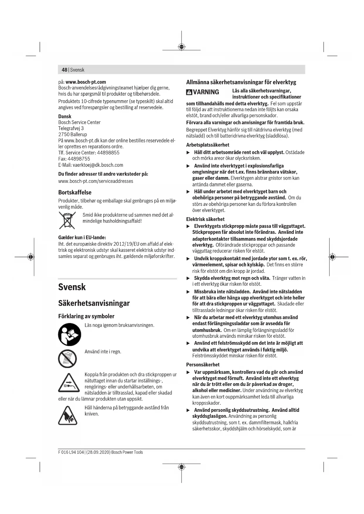 Betjening u Kontroller netspændingen! Strømkildens spænding skal stemme overens med angivelserne på maskinens type- skilt. Tænding/slukning (se Fig. C og D) Produktet tændes ved først at trykke på kontaktspærren (3) og holde den nedtrykket. Tryk derefter på start-stop-kontak- ten (2) og hold den nede. Produktet slukkes ved at slippe kontaktspærren (3) og så start-stop-kontakten (2). Arbejde med hækkeklipperen (se Fig. E) Bevæg hækkeklipperen ensartet på snitlinjen. Det dobbeltsi- dede knivbjælke gør det muligt at klippe i begge retninger el- ler at svinge klipperen fra den ene side til den anden. Klip først siderne og herefter toppen på hækken. For at få siderne lige anbefales det at klippe nedefra og op i hækkens vokseretning. Hvis hækken klippes oppefra og ned, bevæger de tynde grene sig udad, hvorved der kan opstå tynde steder eller huller i hækken. Toppen på hækken klippes ved hjælp af en hjælpesnor, som spændes i den ønskede højde langs med hækken. Kontroller, at der ikke klippes i genstande som f.eks. tråd. Kniv eller drev kan blive beskadiget. Fejlsøgning Symptom Mulig årsag Afhjælpning Hækkeklipper arbejder ikke Strøm er afbrudt Kontroller og tænd for strømmen Stikkontakt er defekt Prøv en anden stikkontakt Netkabel er beskadiget Kontroller netkabel og kontakt kundeservice, hvis den er beskadiget Forlængerledning er beskadiget Kontroller forlængerledning og skift den, hvis den er beskadiget Defekt/sprunget sikring Udskift sikring Hækkeklipper arbejder med afbrydelser Haveredskabets indvendige ledninger er beskadi- get Kontakt serviceforhandleren Start-stop-kontakten er defekt Kontakt serviceforhandleren Motor går, knive be- væger sig ikke Intern fejl Kontakt serviceforhandleren Knive bliver varme Knive er sløve Få knivbjælke slebet Kniv har hakker Få knivbjælke kontrolleret For meget friktion på grund af manglende smøring Sprøjt over med smøreolie For stor vibration/støj Haveredskab defekt Kontakt serviceforhandleren Vedligeholdelse og service Vedligeholdelse, rengøring og opbevaring u Træk stikket ud af stikdåsen, før der arbejdes på produktet. u Hold produktet rent for at kunne arbejde godt og sik- kert. Stil ikke andre genstande fra på haveredskabet. Hold altid produktet og ventilationsåbningerne rene for at kunne arbejde godt og sikkert. Sprøjt aldrig vand på produktet. Dyp aldrig produktet i vand. Opbevar produktet et sikkert sted, som skal være tørt og uden for børns rækkevidde. Stil ikke andre genstande fra på produktet. Sikr, at alle møtrikker, bolte og skruer sidder rigtigt, så det er muligt at arbejde sikkert med produktet. Kontrollér produktet og erstat for en sikkerheds skyld slidte eller beskadigede dele. Sørg for kun at montere reservedele, der er godkendt af Bosch. Kundeservice og anvendelsesrådgivning Kundeservice besvarer dine spørgsmål vedr. reparation og vedligeholdelse af dit produkt samt reservedele. Eksplo- sionstegninger og oplysninger om reservedele finder du også Bosch Power Tools F 016 L94 104 | (28.09.2020)48 | Svensk på: www.bosch-pt.com Bosch-anvendelsesrådgivningsteamet hjælper dig gerne, hvis du har spørgsmål til produkter og tilbehørsdele. Produktets 10‑cifrede typenummer (se typeskilt) skal altid angives ved forespørgsler og bestilling af reservedele. Dansk Bosch Service Center Telegrafvej 3 2750 Ballerup På www.bosch-pt.dk kan der online bestilles reservedele el- ler oprettes en reparations ordre. Tlf. Service Center: 44898855 Fax: 44898755 E-Mail: vaerktoej@dk.bosch.com Du finder adresser til andre værksteder på: www.bosch-pt.com/serviceaddresses Bortskaffelse Produkter, tilbehør og emballage skal genbruges på en miljø- venlig måde. Smid ikke produkterne ud sammen med det al- mindelige husholdningsaffald! Gælder kun i EU‑lande: Iht. det europæiske direktiv 2012/19/EU om affald af elek- trisk og elektronisk udstyr skal kasseret elektrisk udstyr ind- samles separat og genbruges iht. gældende miljøforskrifter. Svensk Säkerhetsanvisningar Förklaring av symboler Läs noga igenom bruksanvisningen. Använd inte i regn. Koppla från produkten och dra stickproppen ur nätuttaget innan du startar inställnings-, rengörings- eller underhållsarbeten, om nätsladden är tilltrasslad, kapad eller skadad eller när du lämnar produkten utan uppsikt. Håll händerna på betryggande avstånd från kniven. Allmänna säkerhetsanvisningar för elverktyg VARNING Läs alla säkerhetsvarningar, instruktioner och specifikationer som tillhandahålls med detta elverktyg. Fel som uppstår till följd av att instruktionerna nedan inte följts kan orsaka elstöt, brand och/eller allvarliga personskador. Förvara alla varningar och anvisningar för framtida bruk. Begreppet Elverktyg hänför sig till nätdrivna elverktyg (med nätsladd) och till batteridrivna elverktyg (sladdlösa). Arbetsplatssäkerhet u Håll ditt arbetsområde rent och väl upplyst. Ostädade och mörka areor ökar olycksrisken. u Använd inte elverktyget i explosionsfarliga omgivningar när det t.ex. finns brännbara vätskor, gaser eller damm. Elverktygen alstrar gnistor som kan antända dammet eller gaserna. u Håll under arbetet med elverktyget barn och obehöriga personer på betryggande avstånd. Om du störs av obehöriga personer kan du förlora kontrollen över elverktyget. Elektrisk säkerhet u Elverktygets stickpropp måste passa till vägguttaget. Stickproppen får absolut inte förändras. Använd inte adapterkontakter tillsammans med skyddsjordade elverktyg. Oförändrade stickproppar och passande vägguttag reducerar risken för elstöt. u Undvik kroppskontakt med jordade ytor som t.ex. rör, värmeelement, spisar och kylskåp. Det finns en större risk för elstöt om din kropp är jordad. u Skydda elverktyg mot regn och väta. Tränger vatten in i ett elverktyg ökar risken för elstöt. u Missbruka inte nätsladden. Använd inte nätsladden för att bära eller hänga upp elverktyg