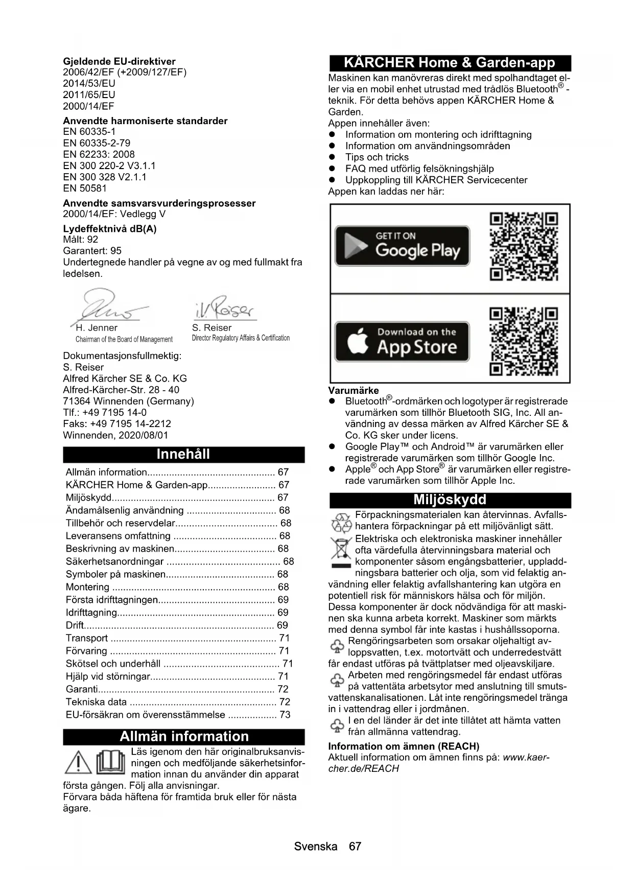 dB(A) 95 95Svenska 67 Gjeldende EU-direktiver 2006/42/EF (+2009/127/EF) 2014/53/EU 2011/65/EU 2000/14/EF Anvendte harmoniserte standarder EN 60335-1 EN 60335-2-79 EN 62233: 2008 EN 300 220-2 V3.1.1 EN 300 328 V2.1.1 EN 50581 Anvendte samsvarsvurderingsprosesser 2000/14/EF: Vedlegg V Lydeffektnivå dB(A) Målt: 92 Garantert: 95 Undertegnede handler på vegne av og med fullmakt fra ledelsen. Dokumentasjonsfullmektig: S. Reiser Alfred Kärcher SE & Co. KG Alfred-Kärcher-Str. 28 - 40 71364 Winnenden (Germany) Tlf.: +49 7195 14-0 Faks: +49 7195 14-2212 Winnenden, 2020/08/01 Innehåll Allmän information Läs igenom den här originalbruksanvis- ningen och medföljande säkerhetsinfor- mation innan du använder din apparat första gången. Följ alla anvisningar. Förvara båda häftena för framtida bruk eller för nästa ägare. KÄRCHER Home & Garden-app Maskinen kan manövreras direkt med spolhandtaget el- ler via en mobil enhet utrustad med trådlös Bluetooth