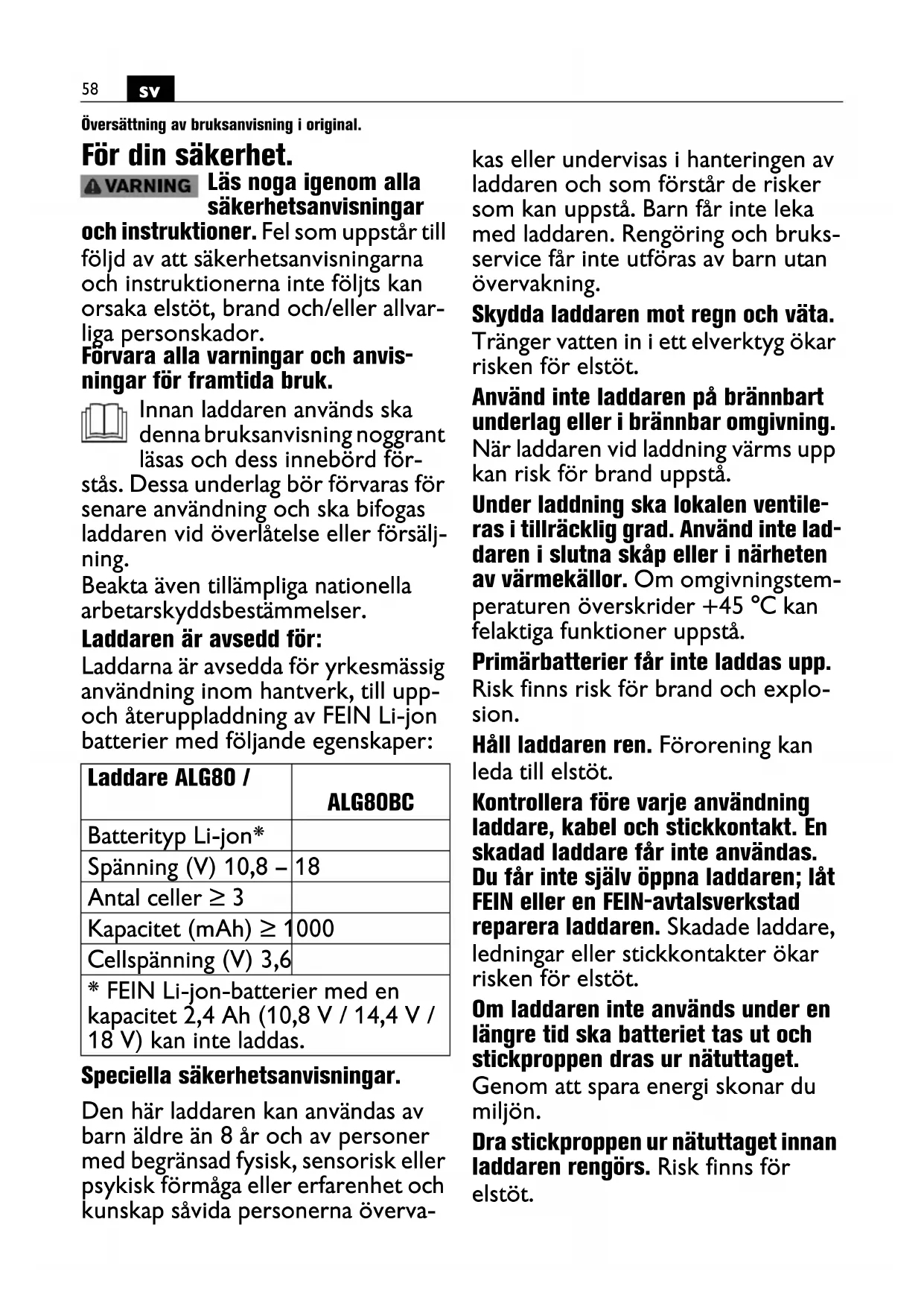 Översättning av bruksanvisning i original. För din säkerhet. Läs noga igenom alla säkerhetsanvisningar och instruktioner. Fel som uppstår till följd av att säkerhetsanvisningarna och instruktionerna inte följts kan orsaka elstöt, brand och/eller allvar- liga personskador. Förvara alla varningar och anvis- ningar för framtida bruk. Innan laddaren används ska denna bruksanvisning noggrant läsas och dess innebörd för- stås. Dessa underlag bör förvaras för senare användning och ska bifogas laddaren vid överlåtelse eller försälj- ning. Beakta även tillämpliga nationella arbetarskyddsbestämmelser. Laddaren är avsedd för: Laddarna är avsedda för yrkesmässig användning inom hantverk, till upp- och återuppladdning av FEIN Li-jon batterier med följande egenskaper: Speciella säkerhetsanvisningar. Den här laddaren kan användas av barn äldre än 8 år och av personer med begränsad fysisk, sensorisk eller psykisk förmåga eller erfarenhet och kunskap såvida personerna överva- kas eller undervisas i hanteringen av laddaren och som förstår de risker som kan uppstå. Barn får inte leka med laddaren. Rengöring och bruks- service får inte utföras av barn utan övervakning. Skydda laddaren mot regn och väta. Tränger vatten in i ett elverktyg ökar risken för elstöt. Använd inte laddaren på brännbart underlag eller i brännbar omgivning. När laddaren vid laddning värms upp kan risk för brand uppstå. Under laddning ska lokalen ventile- ras i tillräcklig grad. Använd inte lad- daren i slutna skåp eller i närheten av värmekällor. Om omgivningstem- peraturen överskrider +45 °C kan felaktiga funktioner uppstå. Primärbatterier får inte laddas upp. Risk finns risk för brand och explo- sion. Håll laddaren ren. Förorening kan leda till elstöt. Kontrollera före varje användning laddare, kabel och stickkontakt. En skadad laddare får inte användas. Du får inte själv öppna laddaren; låt FEIN eller en FEIN-avtalsverkstad reparera laddaren. Skadade laddare, ledningar eller stickkontakter ökar risken för elstöt. Om laddaren inte används under en längre tid ska batteriet tas ut och stickproppen dras ur nätuttaget. Genom att spara energi skonar du miljön. Dra stickproppen ur nätuttaget innan laddaren rengörs. Risk finns för elstöt. Laddare ALG80 / ALG80BC Batterityp Li-jon* Spänning (V) 10,8 – 18 Antal celler ≥ 3 Kapacitet (mAh) ≥ 1000 Cellspänning (V) 3,6