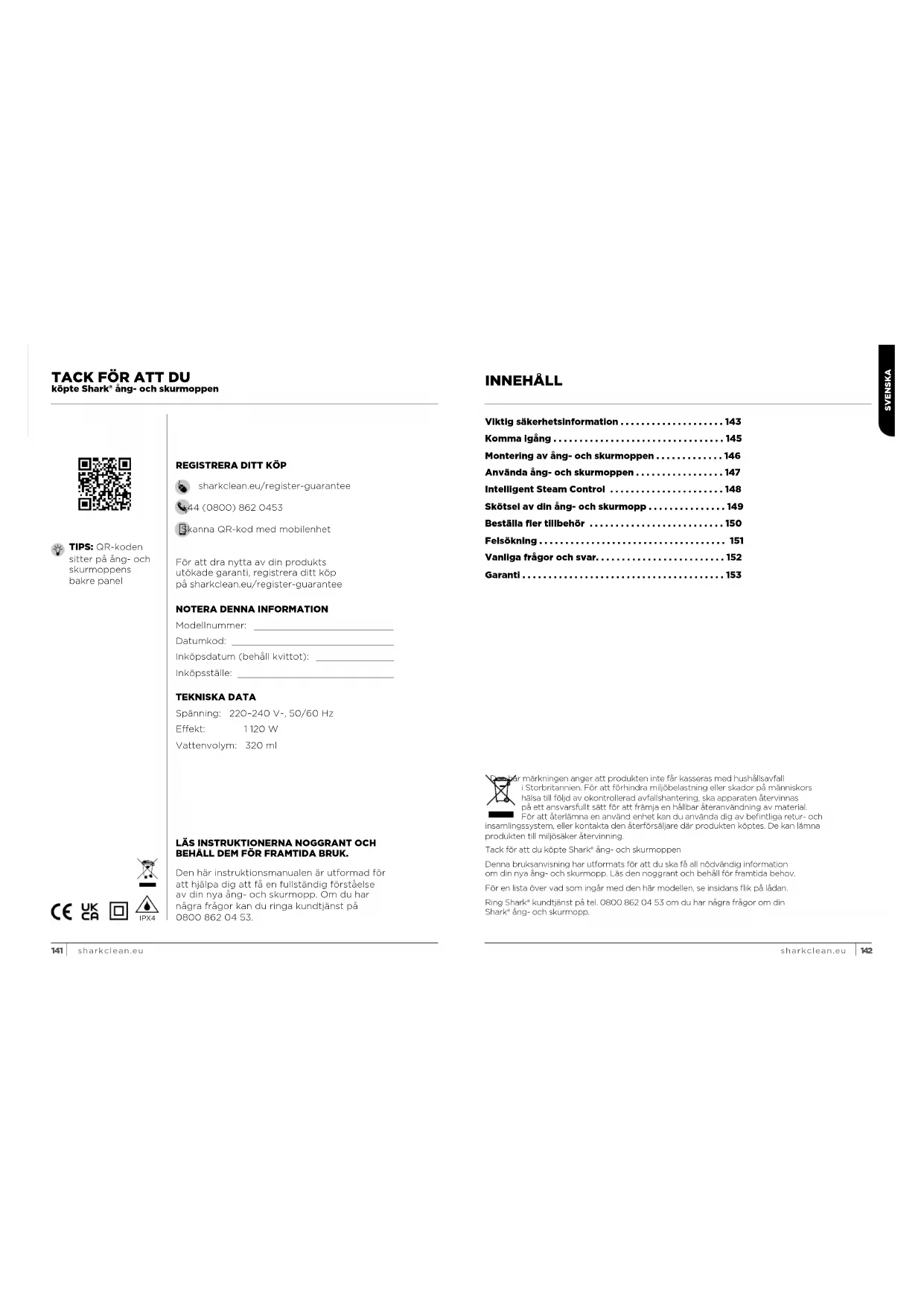 sharkclean.eu/register-guarantee +44 (0800) 862 0453 Skanna QR-kod med mobilenhet Den här märkningen anger att produkten inte får kasseras med hushållsavfall i Storbritannien. För att förhindra miljöbelastning eller skador på människors hälsa till följd av okontrollerad avfallshantering, ska apparaten återvinnas påett ansvarsfullt sätt för att främja en hållbar återanvändning av material. Föratt återlämna en använd enhet kan du använda dig av befintliga retur- och insamlingssystem, eller kontakta den återförsäljare där produkten köptes. De kan lämna produkten till miljösäker återvinning. Tack för att du köpte Shark® ång- och skurmoppen Denna bruksanvisning har utformats för att du ska få all nödvändig information omdinnya ång- och skurmopp. Läs den noggrant och behåll för framtida behov. För en lista över vad som ingår med den här modellen, se insidans flik på lådan. Ring Shark® kundtjänst på tel. 0800 862 0453 om du har några frågor om din Shark® ång- och skurmopp. IPX4 TIPS: QR-koden sitter på ång- och skurmoppens bakre panelVARNING Den här apparaten är inte avsedd att användas avpersoner med nedsatt fysisk, sensorisk eller psykisk förmåga, eller som saknar erfarenhet eller kunskap, om de inte övervakas eller får instruktioner om apparatens användning av en person som är ansvarig för deras säkerhet Barnfårinte använda eller leka med den här apparaten Noggrann uppsikt krävs för att hålla apparaten och sladden utom räckhåll för barn under användning SVENSKA 144sharkclean.eu143 sharkclean.eu VARNING: Skållningsrisk. Ångan somavges från ångmoppen är mycket het och kan orsaka skållning.Iaktta försiktighet när duanvänder ång- och skurmoppen. VARNING: Håll ångmoppen på avstånd från barn. VARNING: Barn bör hållas under uppsikt så att de inte leker med apparaten. 1 Utrustningen kan användas av personer med nedsatt fysisk, sensorisk eller mental förmåga, eller personer som saknar erfarenhet och kunskap, om de har fått instruktioner om hur apparaten ska användas på ett säkert sätt och förstår de faror som är inblandade. Låt inte barn utföra rengöring och underhåll. Förvara apparaten och dess nätsladd oåtkomligt för barn. Tillåt INTE att den används som en leksak. Noggrann övervakning krävs när dammsugaren används i närheten av barn. 2 Förvara utrustningen oåtkomligt för barn när den är laddad eller kyls ner. 3 Lägg ALDRIG ång- och skurmoppen på sidan och rikta inte ånga mot person, husdjur eller växter under användning. Vätska eller ånga får inte riktas mot utrustning innehållande elektriska komponenter som t.ex. insidan av ugnen. 4 Påfyllningsöppningen ska inte vara öppen under användning. 5 Använd enheten ENDAST för dess avsedda användning. 6 ANVÄND INTE för att värma upp ettrum. 7 ANVÄND INTE utomhus. 8 LÄMNA INTE ång- och skurmoppen utan uppsikt när den är ansluten. DraALLTID ut sladden ur eluttaget när den inte används och före underhåll. 9 LÅT INTE barn använda ång- och skurmoppen. Noggrann uppsikt krävs när apparaten används i närheten av barn, husdjur eller växter. 10 Använd ENDAST enligt beskrivningen ibruksanvisningen. 11 Använd ENDAST tillverkarens rekommenderade tillbehör. 12 ANVÄND INTE apparaten med skadad sladd eller stickkontakt. Omång- och skurmoppen inte fungerar ordentligt eller om den har tappats, skadats, lämnats utomhus eller hamnat i vatten, återlämna den till SharkNinja Europe Limited för undersökning och reparation. Felaktig återmontering eller reparation kan medföra risk för elstötar eller personskada när ång- och skurmoppen används.