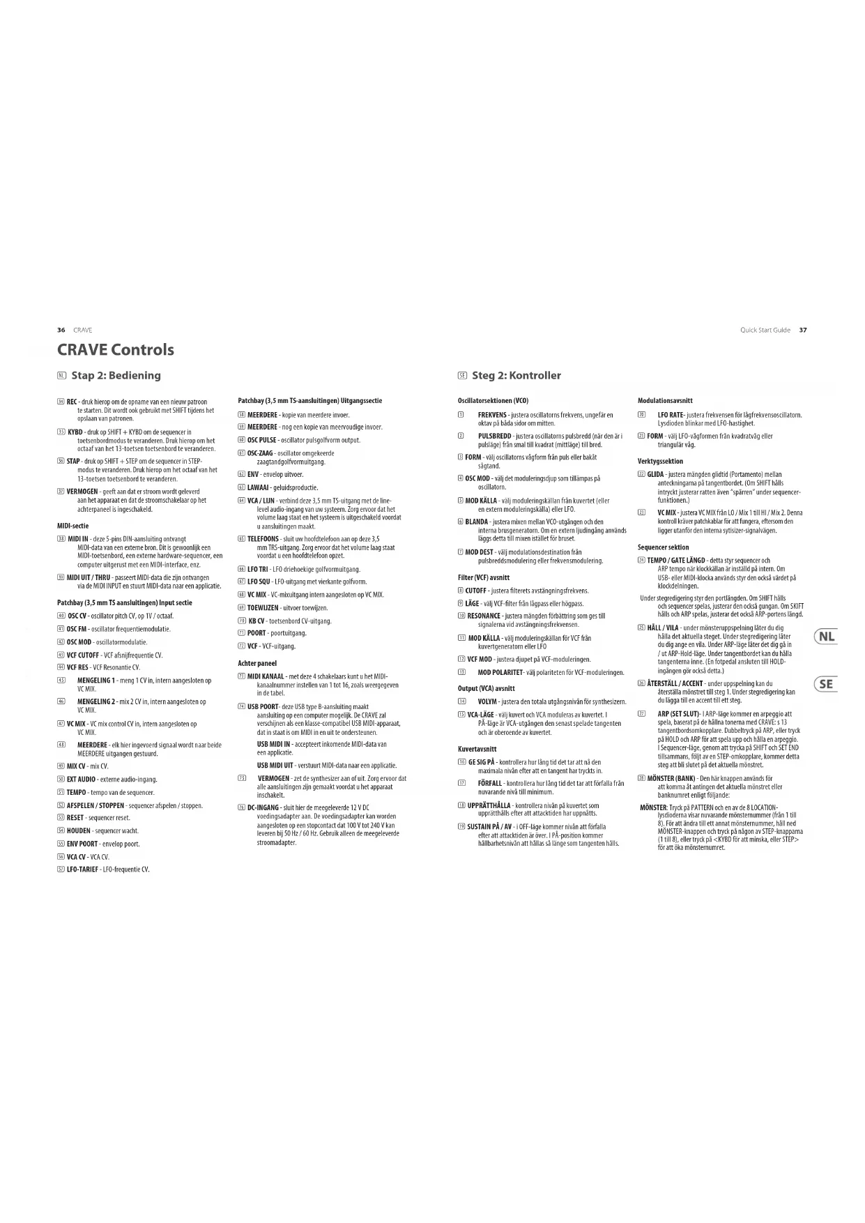 vast te houden. (De LED knippert langzaam.) FIRMWARE UPDATE De SynthTool-app kan gratis worden gedownload vanaf de CRAVE- productpagina van onze website: behringer.com. Het nieuwste bestand kan worden gedownload en op uw computer worden opgeslagen en vervolgens worden gebruikt om de CRAVE indien nodig bij te werken. 54 55Quick Start GuideCRAVE(SE) Steg 3: Komma igång CRAVE Komma igång ÖVERSIKT Denna “komma igång” -guide hjälper dig att ställa in CRAVE analog synthesizer och kort presentera dess funktioner. FÖRBINDELSE För att ansluta CRAVE till ditt system, se anslutningsguiden tidigare i detta dokument. PROGRAMINSTÄLLNINGAR CRAVE är en USB-klass MIDI-enhet, och därför krävs ingen installation av drivrutiner. CRAVE kräver inga ytterligare drivrutiner för att fungera med Windows och MacOS.