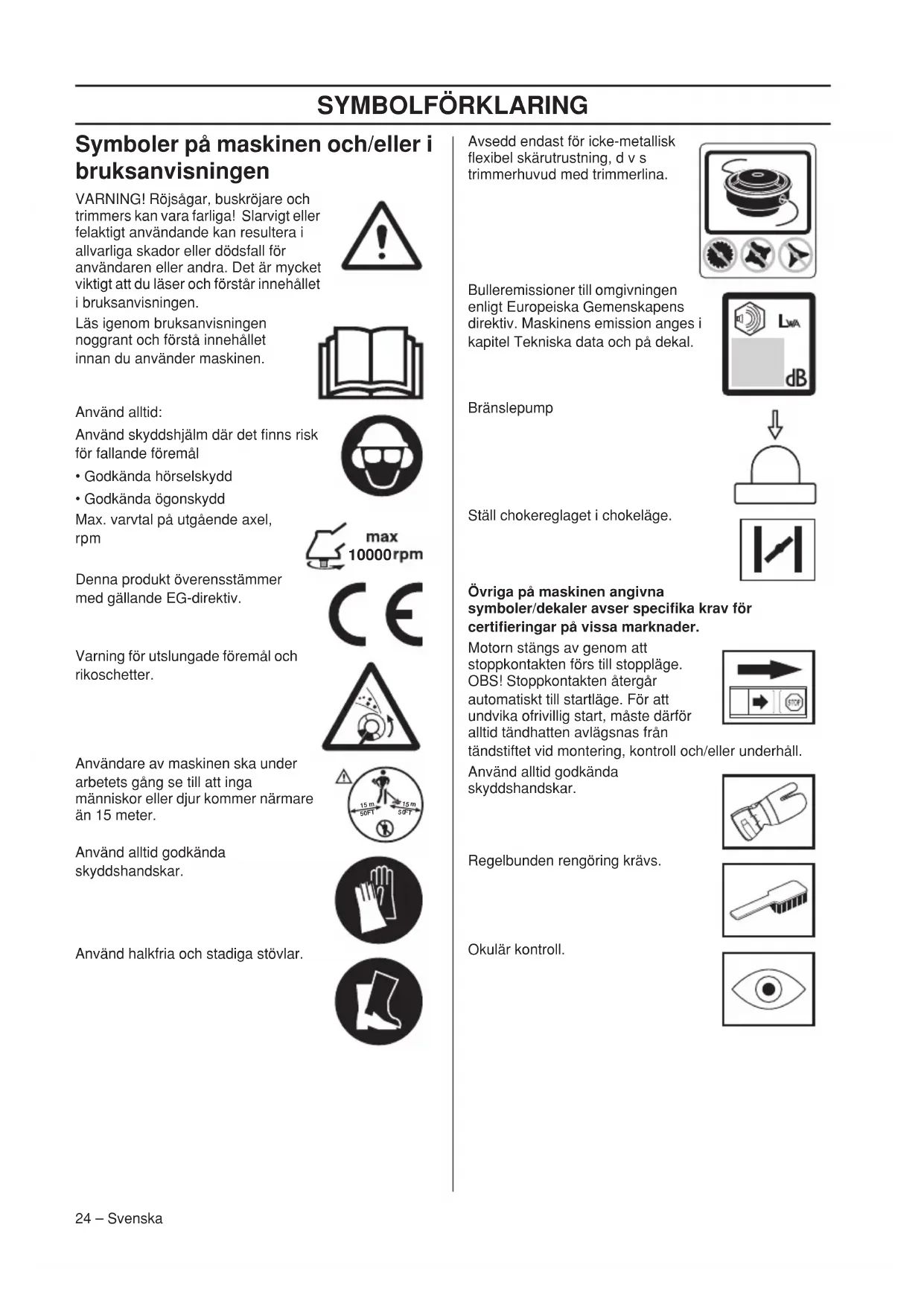 - Godkända ögonskydd Max. varvtal på utgående axel, rpm Denna produkt överensstämmer med gällande EG-direktiv. Varning för utslungade föremål och rikoschetter. Användare av maskinen ska under arbetets gång se till att inga människor eller djur kommer närmare än 15 meter. Använd alltid godkända skyddshandskar. Använd halkfria och stadiga stövlar. Avsedd endast för icke-metallisk flexibel skärutrustning, d v s trimmerhuvud med trimmerlina. Bulleremissioner till omgivningen enligt Europeiska Gemenskapens direktiv. Maskinens emission anges i kapitel Tekniska data och på dekal. Bränslepump Ställ chokereglaget i chokeläge. Övriga på maskinen angivna symboler/dekaler avser specifika krav för certifieringar på vissa marknader. Motorn stängs av genom att stoppkontakten förs till stoppläge. OBS! Stoppkontakten återgår automatiskt till startläge. För att undvika ofrivillig start, måste därför alltid tändhatten avlägsnas från tändstiftet vid montering, kontroll och/eller underhåll. Använd alltid godkända skyddshandskar. Regelbunden rengöring krävs. Okulär kontroll.
