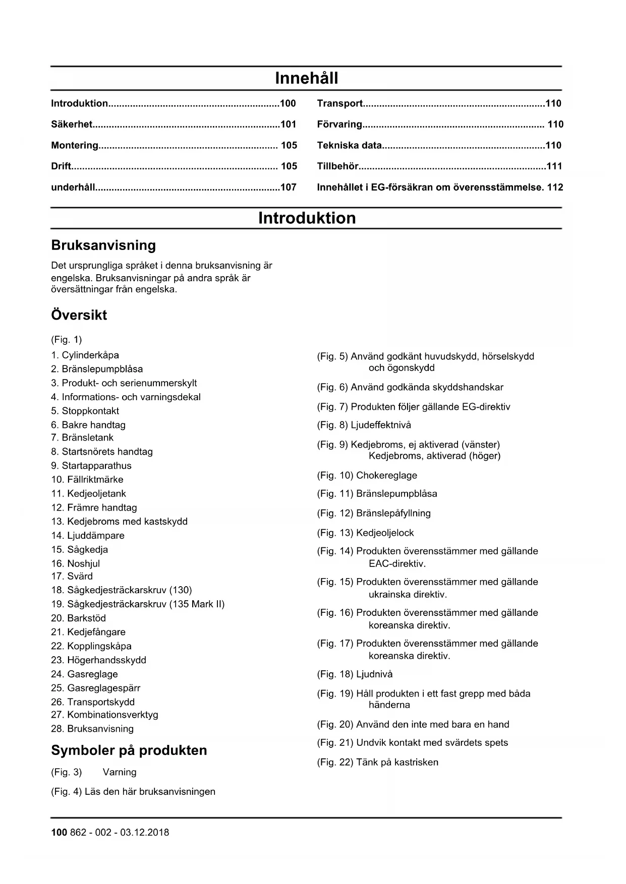 Symboler på produkten (Fig. 3) Varning (Fig. 4) Läs den här bruksanvisningen (Fig. 5) Använd godkänt huvudskydd, hörselskydd och ögonskydd (Fig. 6) Använd godkända skyddshandskar (Fig. 7) Produkten följer gällande EG-direktiv (Fig. 8) Ljudeffektnivå (Fig. 9) Kedjebroms, ej aktiverad (vänster) Kedjebroms, aktiverad (höger) (Fig. 10) Chokereglage (Fig. 11) Bränslepumpblåsa (Fig. 12) Bränslepåfyllning (Fig. 13) Kedjeoljelock (Fig. 14) Produkten överensstämmer med gällande EAC-direktiv. (Fig. 15) Produkten överensstämmer med gällande ukrainska direktiv. (Fig. 16) Produkten överensstämmer med gällande koreanska direktiv. (Fig. 17) Produkten överensstämmer med gällande koreanska direktiv. (Fig. 18) Ljudnivå (Fig. 19) Håll produkten i ett fast grepp med båda händerna (Fig. 20) Använd den inte med bara en hand (Fig. 21) Undvik kontakt med svärdets spets (Fig. 22) Tänk på kastrisken 100 862 - 002 - 03.12.2018(Fig. 23) Denna produkt överensstämmer med gällande direktiv i Australien och Nya Zeeland angående elektromagnetisk kompatibilitet. Notera: Övriga symboler/dekaler på produkten avser specifika krav för certifieringar på andra kommersiella marknader. Proposition 65 (Fig. 1) EU V VARNING: Manipulering av motorn upphäver EG-typgodkännandet för den här produkten. Produktansvar Enligt lagstiftningen för produktansvar ansvarar vi inte för skador som vår produkt orsakar om:
