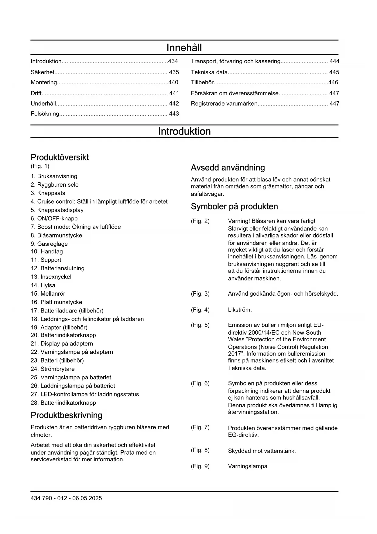 Produktbeskrivning Produkten är en batteridriven ryggburen blåsare med elmotor. Arbetet med att öka din säkerhet och effektivitet under användning pågår ständigt. Prata med en serviceverkstad för mer information. Avsedd användning Använd produkten för att blåsa löv och annat oönskat material från områden som gräsmattor, gångar och asfaltsvägar. Symboler på produkten (Fig. 2) Varning! Blåsaren kan vara farlig! Slarvigt eller felaktigt användande kan resultera i allvarliga skador eller dödsfall för användaren eller andra. Det är mycket viktigt att du läser och förstår innehållet i bruksanvisningen. Läs igenom bruksanvisningen noggrant och se till att du förstår instruktionerna innan du använder maskinen. (Fig. 3) Använd godkända ögon- och hörselskydd. (Fig. 4) Likström. (Fig. 5) Emission av buller i miljön enligt EU- direktiv 2000/14/EC och New South Wales ”Protection of the Environment Operations (Noise Control) Regulation 2017”. Information om bulleremission finns på maskinens etikett och i avsnittet Tekniska data. (Fig. 6) Symbolen på produkten eller dess förpackning indikerar att denna produkt ej kan hanteras som hushållsavfall. Denna produkt ska överlämnas till lämplig återvinningsstation. (Fig. 7) Produkten överensstämmer med gällande EG-direktiv. (Fig. 8) Skyddad mot vattenstänk. (Fig. 9) Varningslampa 434 790 - 012 - 06.05.2025(Fig. 10) ON/OFF-knapp (Fig. 11) Boost mode-knapp (Fig. 12) Cruise control-knapp (Fig. 13) Om produkten har trådlös Bluetooth