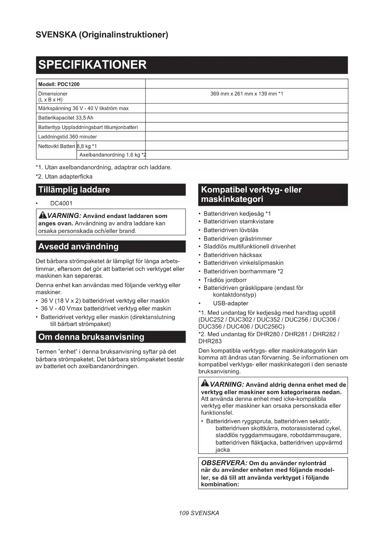 - DC4001 VARNING: Använd endast laddaren som anges ovan. Användning av andra laddare kan orsaka personskada och/eller brand. Avsedd användning Det bärbara strömpaketet är lämpligt för långa arbets- timmar, eftersom det gör att batteriet och verktyget eller maskinen kan separeras. Denna enhet kan användas med följande verktyg eller maskiner.