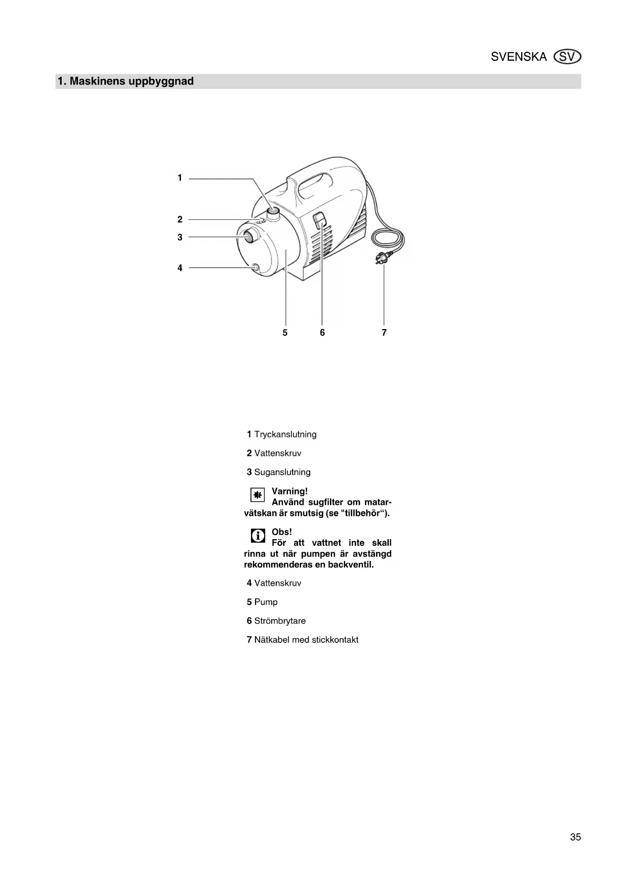 Obs! För att vattnet inte skall rinna ut när pumpen är avstängd rekommenderas en backventil. 4 Vattenskruv 5 Pump 6 Strömbrytare 7 Nätkabel med stickkontakt Bruksanvisning SVENSKA36 SVENSKA