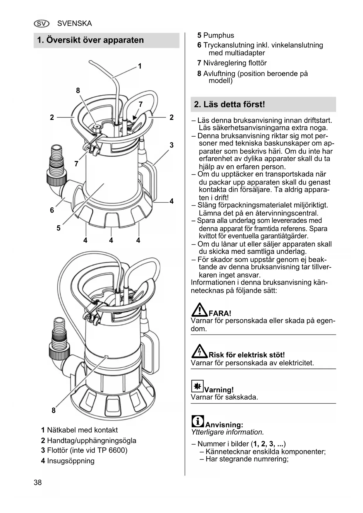 ningar – Beakta följande säkerhetsanvisningar vid användning av denna apparat för att und- vika fara för person eller sakskada. – Beakta gällande föreskrifter eller arbetar- skyddsföreskrifter för hantering av dränk- bara pumpar. – Rätta dig efter bestämmelserna enligt DIN VDE 0100 -702, -738 vid användning i simbassänger och dammar och i deras skyddsområde. Beakta vid behov även lokala föreskrifter. – Apparaten måste avsäkras med en jord- felsbrytare (RCD) med en felström på max 30 mA. AAllmän fara! Använd inte apparaten när personer är i kon- takt med vätskan som pumpas (t. ex. i sim- bassänger eller damm)! Följande restrisker uppstår vid drift med dränkbara pumpar – de kan inte helt uteslu- tas ens med säkerhetsåtgärder. AFara vid yttre påverkan! Använd inte apparaten i explosionsfarliga områden eller i närheten av brandfarliga vätskor eller gaser! AFara genom hett vatten! Om tryckbrytarens avstängningstryck inte nås på grund av dåliga tryckförhållanden el- ler en defekt tryckbrytare kan vattnet inne i apparaten värmas upp genom den interna cirkulationen. Det kan leda till skador och otättheter på ap- paraten och anslutningsledningarna. Där kan hett vatten släppas ut. Skållningsrisk! Apparaten får köras max 5 minuter mot en stängd tryckledning. Skilj apparaten från el-nätet och låt den svalna. Innan anläggningen tas i drift igen skall dess felfria funktion kontrolleras av fackpersonal.