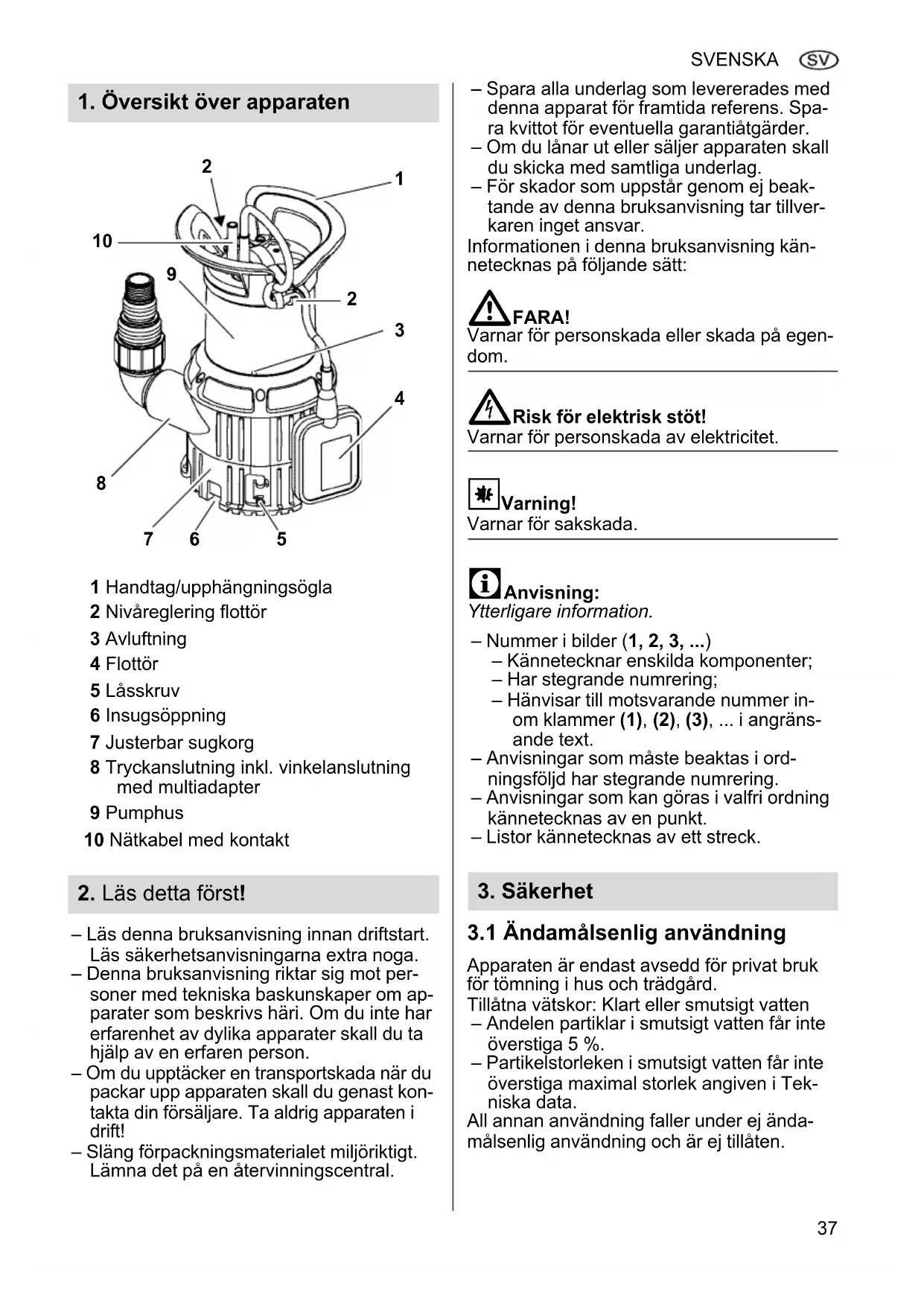 I_0009sv4A.fm 5.7.10 Original bruksanvisning38 SVENSKA Typiskt användningsområde – Tömning av behållare, vattenkar, simbas- sänger, schakt eller översvämmade ut- rymmen. – Bevattning av trädgårdar och gräsmattor. EJ ändamålsenlig användning Apparaten är ej avsedd för – Transport av vätskor med en temperatur överstigande 35 °C. – Dricksvattenförsörjning eller transport av livsmedel. – Transport av saltvatten. – Transport av explosiva, brandfarliga, ag- gressiva eller hälsovådliga partiklar som fekalier. – Kommersiell eller industriell användning. – Kontinuerlig cirkulation (damm). Personer (endast barn och unga) får inte an- vända apparaten när de har – nedsatt fysisk och/eller mental hälsa, – nedsatt sinnesförmåga, – otillräcklig erfarenhet och/eller kännedom om hantering av apparaten, eller – inte har läst och förstått bruksanvisningen. För skador som uppstår genom ej ändamåls- enlig användning övertar tillverkaren inget ansvar. Genom ej ändamålsenlig användning, för- ändring av apparaten eller genom att använ- da delar som inte är godkända av tillverka- ren, kan oförutsedda skador uppstå!