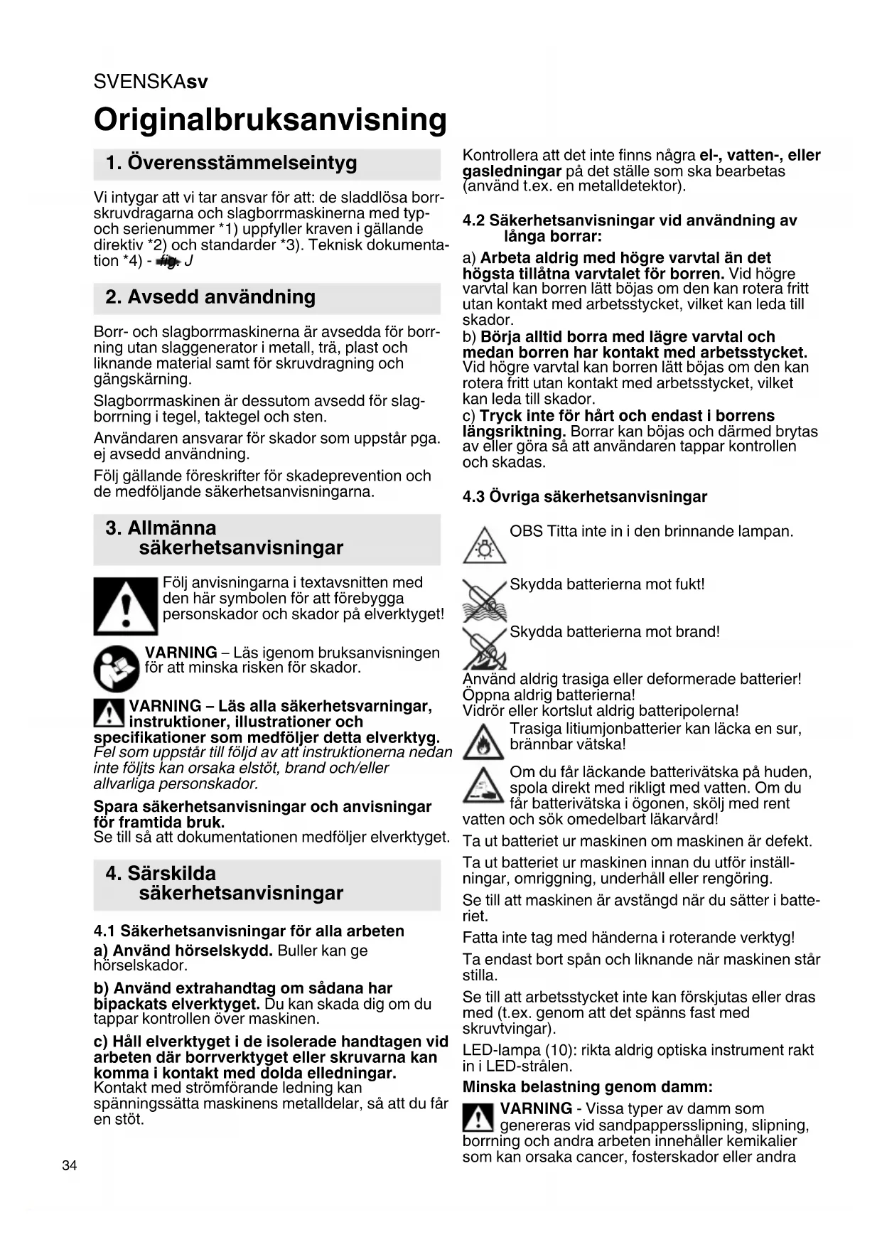Vi intygar att vi tar ansvar för att: de sladdlösa borr- skruvdragarna och slagborrmaskinerna med typ- och serienummer *1) uppfyller kraven i gällande direktiv *2) och standarder *3). Teknisk dokumenta- tion *4) - fig. J Borr- och slagborrmaskinerna är avsedda för borr- ning utan slaggenerator i metall, trä, plast och liknande material samt för skruvdragning och gängskärning. Slagborrmaskinen är dessutom avsedd för slag- borrning i tegel, taktegel och sten. Användaren ansvarar för skador som uppstår pga. ej avsedd användning. Följ gällande föreskrifter för skadeprevention och de medföljande säkerhetsanvisningarna. Följ anvisningarna i textavsnitten med den här symbolen för att förebygga personskador och skador på elverktyget! VARNING – Läs igenom bruksanvisningen för att minska risken för skador. VARNING – Läs alla säkerhetsvarningar, instruktioner, illustrationer och specifikationer som medföljer detta elverktyg. Fel som uppstår till följd av att instruktionerna nedan inte följts kan orsaka elstöt, brand och/eller allvarliga personskador. Spara säkerhetsanvisningar och anvisningar för framtida bruk. Se till så att dokumentationen medföljer elverktyget.
