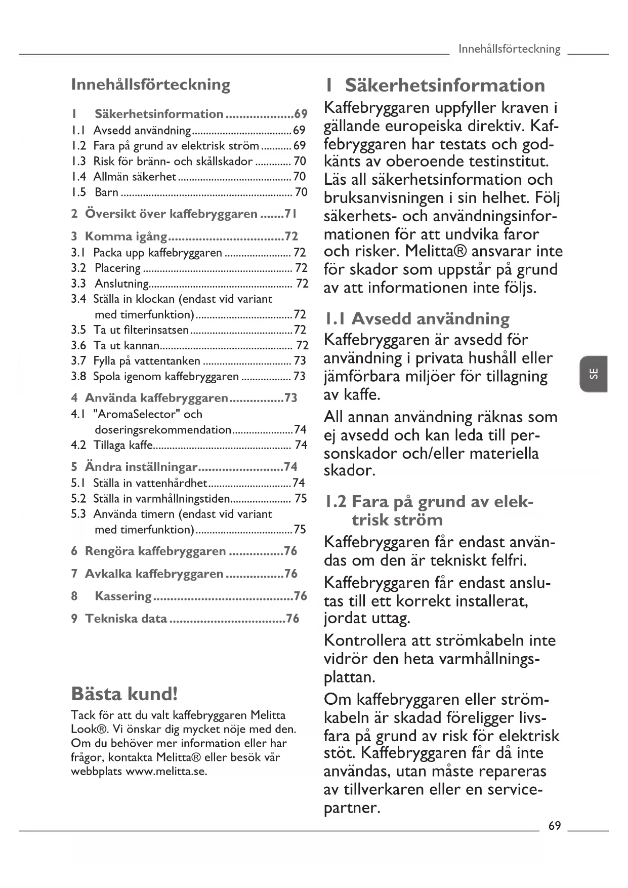- 9 Tekniska data 1 Säkerhetsinformation Kaffebryggaren uppfyller kraven i gällande europeiska direktiv. Kaf- febryggaren har testats och god- känts av oberoende testinstitut. Läs all säkerhetsinformation och bruksanvisningen i sin helhet. Följ säkerhets- och användningsinfor- mationen för att undvika faror och risker. Melitta® ansvarar inte för skador som uppstår på grund av att informationen inte följs. p. 76