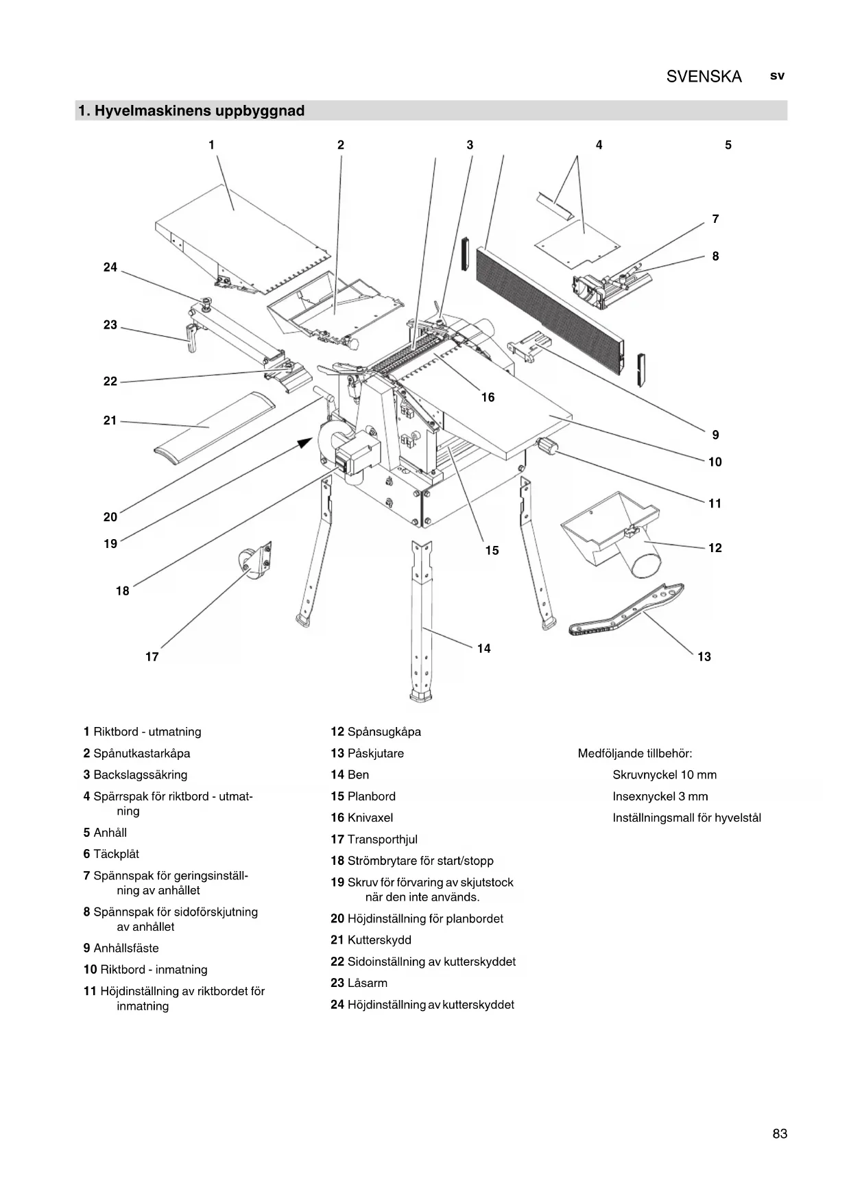 1 Riktbord - utmatning 2 Spånutkastarkåpa 3 Backslagssäkring 4 Spärrspak för riktbord - utmat- ning 5 Anhåll 6 Täckplåt 7 Spännspak för geringsinställ- ning av anhållet 8 Spännspak för sidoförskjutning av anhållet 9 Anhållsfäste 10 Riktbord - inmatning 11 Höjdinställning av riktbordet för inmatning 12 Spånsugkåpa 13 Påskjutare 14 Ben 15 Planbord 16 Knivaxel 17 Transporthjul 18 Strömbrytare för start/stopp 19 Skruv för förvaring av skjutstock när den inte används. 20 Höjdinställning för planbordet 21 Kutterskydd 22 Sidoinställning av kutterskyddet 23 Låsarm 24 Höjdinställning av kutterskyddet Medföljande tillbehör: Skruvnyckel 10 mm Insexnyckel 3 mm Inställningsmall för hyvelstål HC260_XW0014D5_sv.fm Översättning av originalbruks- anvisningen84 SVENSKA