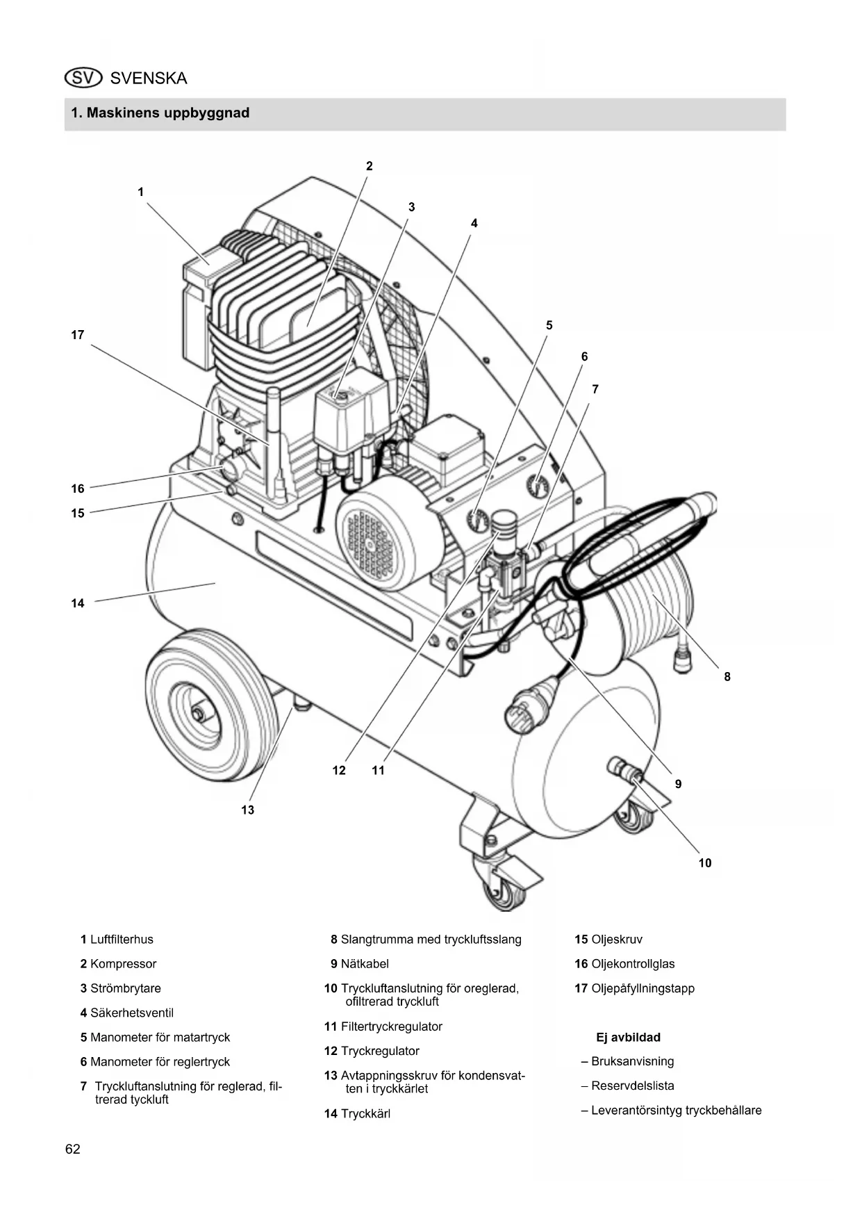 1 Luftfilterhus 2 Kompressor 3 Strömbrytare 4 Säkerhetsventil 5 Manometer för matartryck 6 Manometer för reglertryck 7 Tryckluftanslutning för reglerad, fil- trerad tyckluft 8 Slangtrumma med tryckluftsslang 9 Nätkabel 10 Tryckluftanslutning för oreglerad, ofiltrerad tryckluft 11 Filtertryckregulator 12 Tryckregulator 13 Avtappningsskruv för kondensvat- ten i tryckkärlet 14 Tryckkärl 15 Oljeskruv 16 Oljekontrollglas 17 Oljepåfyllningstapp Ej avbildad – Bruksanvisning – Reservdelslista – Leverantörsintyg tryckbehållare Xk0017A2.fm Bruksanvisning SVENSKA63 SVENSKA
