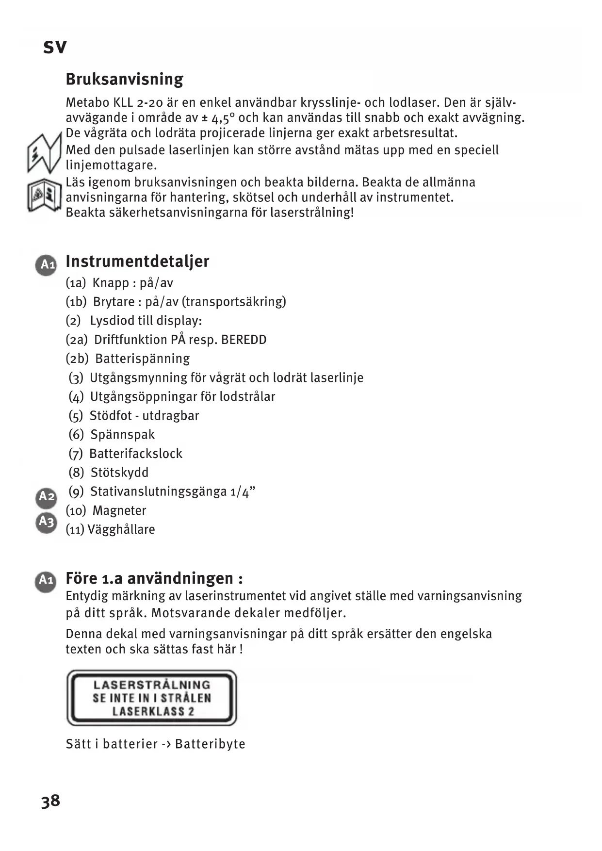 Bruksanvisning Metabo KLL 2-20 är en enkel användbar krysslinje- och lodlaser. Den är själv- avvägande i område av ± 4,5° och kan användas till snabb och exakt avvägning. De vågräta och lodräta projicerade linjerna ger exakt arbetsresultat. Med den pulsade laserlinjen kan större avstånd mätas upp med en speciell linjemottagare. Läs igenom bruksanvisningen och beakta bilderna. Beakta de allmänna anvisningarna för hantering, skötsel och underhåll av instrumentet. Beakta säkerhetsanvisningarna för laserstrålning! Instrumentdetaljer (1a) Knapp : på/av (1b) Brytare : på/av (transportsäkring) (2) Lysdiod till display: (2a) Driftfunktion PÅ resp. BEREDD (2b) Batterispänning (3) Utgångsmynning för vågrät och lodrät laserlinje (4) Utgångsöppningar för lodstrålar (5) Stödfot - utdragbar (6) Spännspak (7) Batterifackslock (8) Stötskydd (9) Stativanslutningsgänga 1/4” (10) Magneter (11) Vägghållare Före 1.a användningen : Entydig märkning av laserinstrumentet vid angivet ställe med varningsanvisning på ditt språk. Motsvarande dekaler medföljer. Denna dekal med varningsanvisningar på ditt språk ersätter den engelska texten och ska sättas fast här ! Sätt i batterier -> Batteribyte