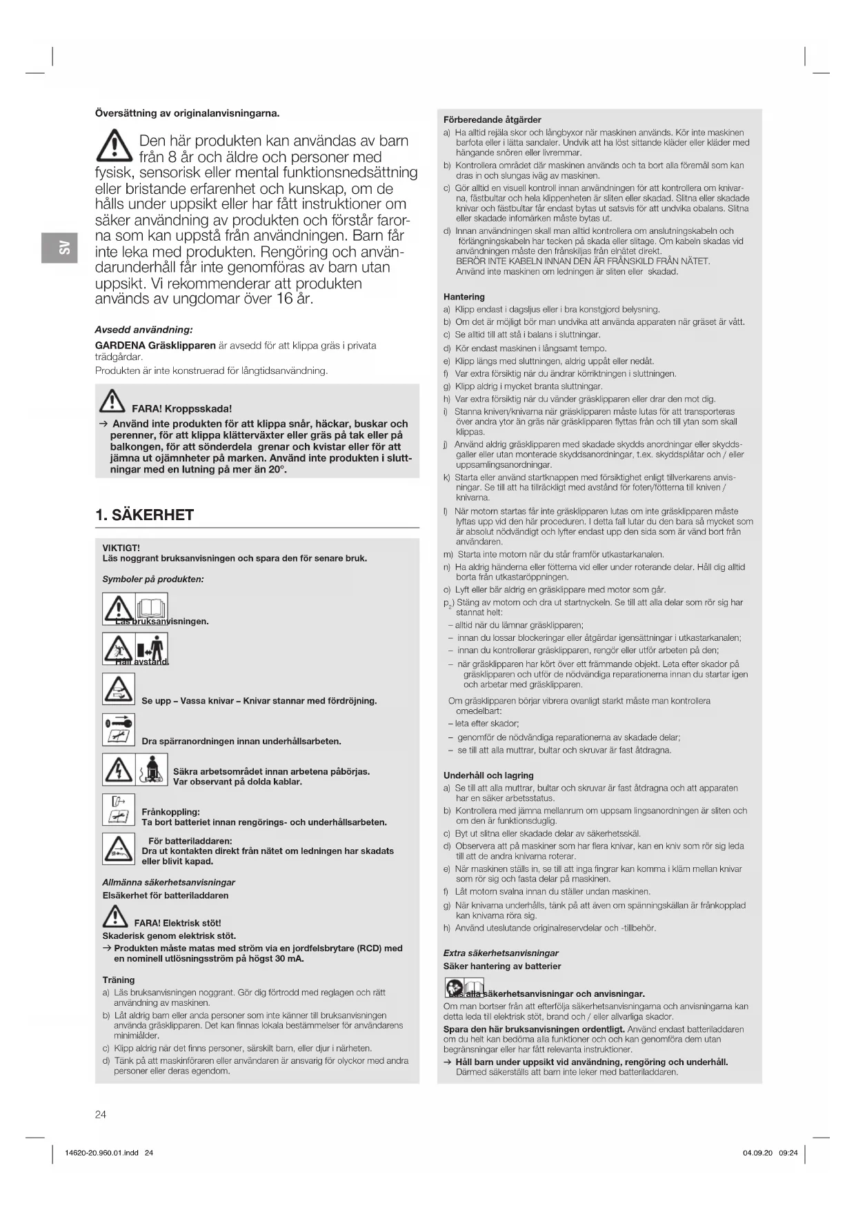 Översättning av originalanvisningarna. Den här produkten kan användas av barn från 8 år och äldre och personer med fysisk, sensorisk eller mental funktionsnedsättning eller bristande erfarenhet och kunskap, om de hålls under uppsikt eller har fått instruktioner om säker användning av produkten och förstår faror- na som kan uppstå från användningen. Barn får inte leka med produkten. Rengöring och använ- darunderhåll får inte genomföras av barn utan uppsikt. Vi rekommenderar att produkten används av ungdomar över 16 år. Avsedd användning: GARDENA Gräsklipparen är avsedd för att klippa gräs i privata trädgårdar. Produkten är inte konstruerad för långtidsanvändning. FARA! Kroppsskada! v Använd inte produkten för att klippa snår, häckar, buskar och perenner, för att klippa klätterväxter eller gräs på tak eller på balkongen, för att sönderdela grenar och kvistar eller för att jämna ut ojämnheter på marken. Använd inte produkten i slutt- ningar med en lutning på mer än 20°. 14620-20.960.01.indd 24 04.09.20 09:24SV