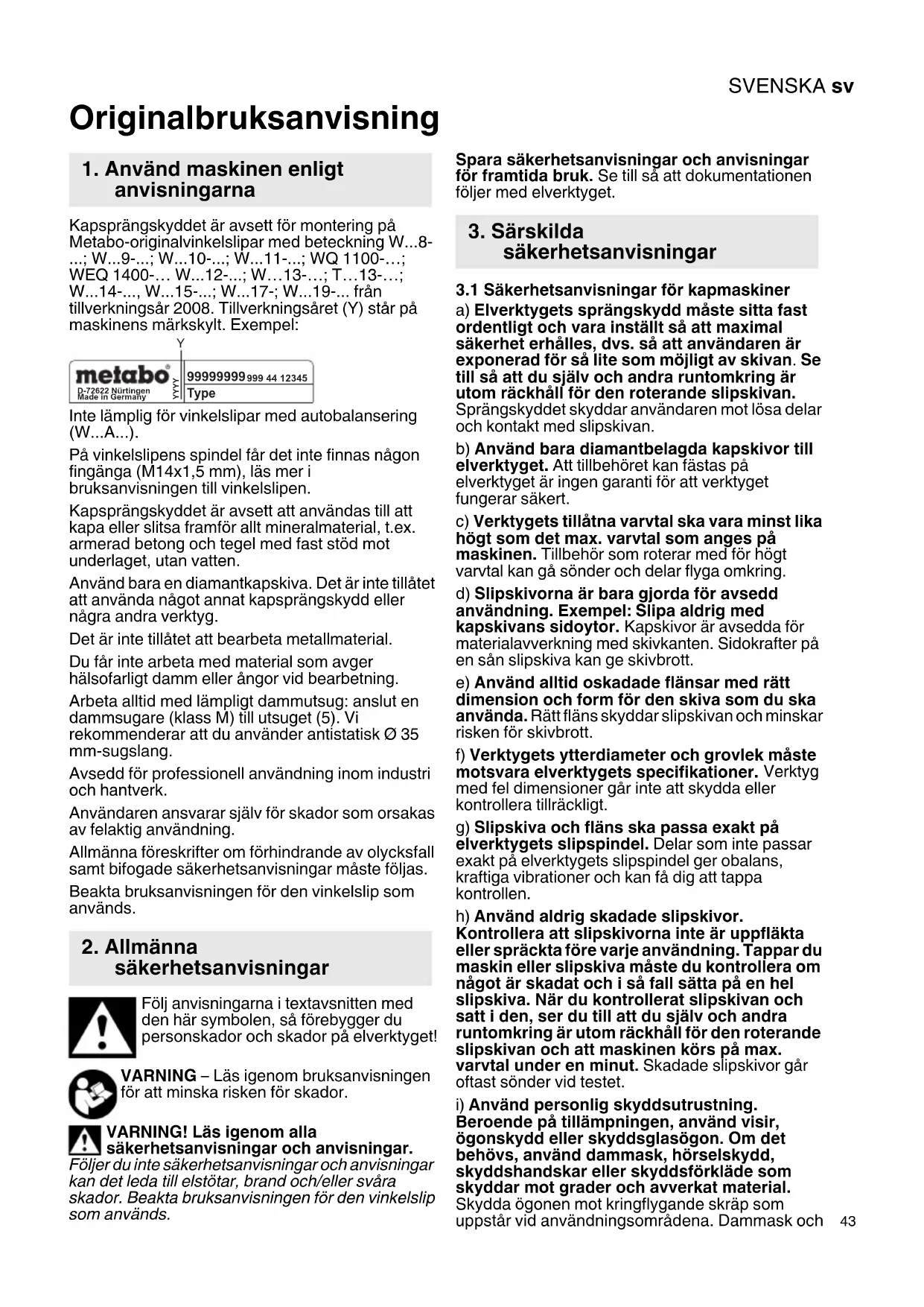 - Originalbruksanvisning Kapsprängskyddet är avsett för montering på Metabo-originalvinkelslipar med beteckning W - p. 8
