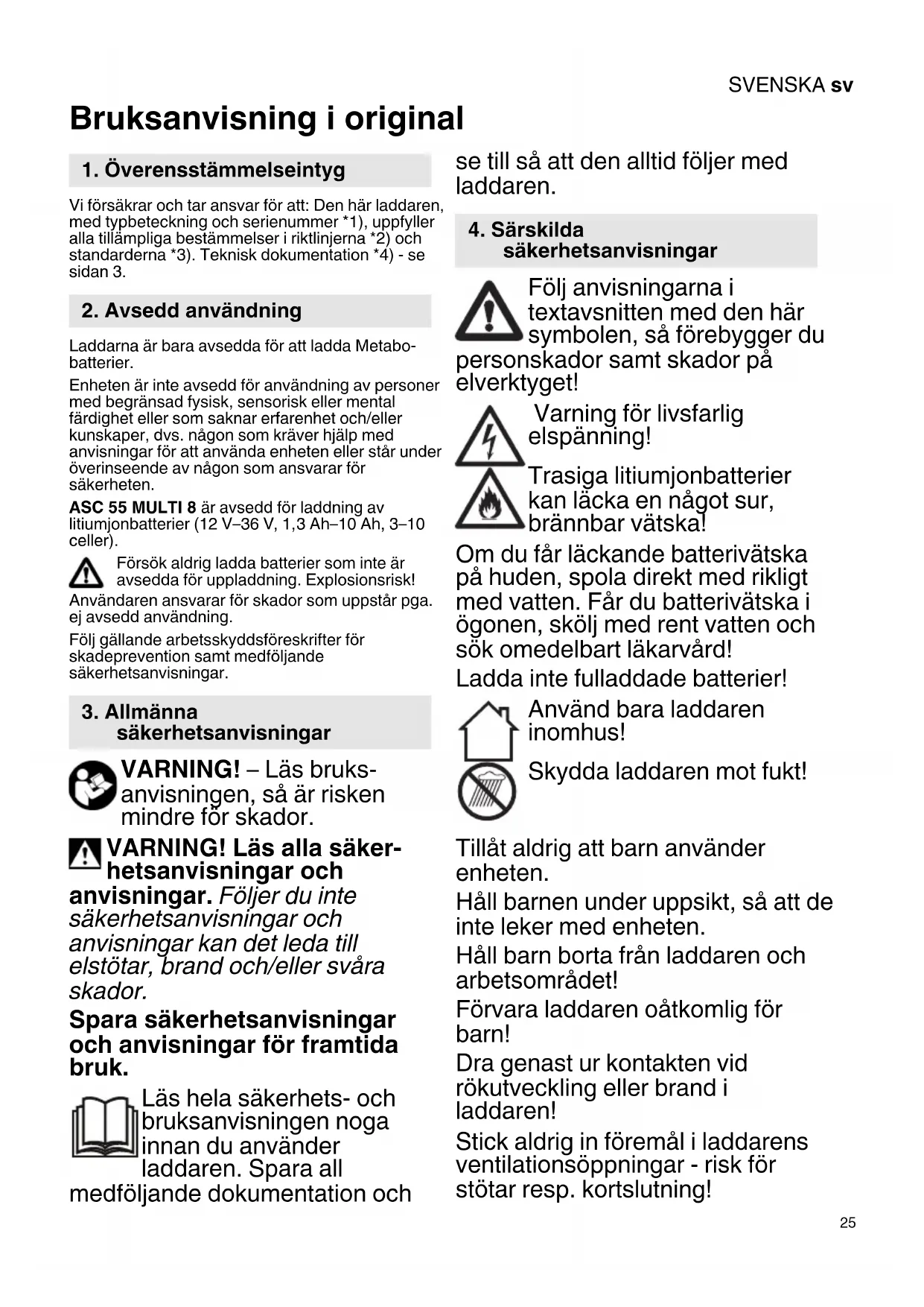 Bruksanvisning i original Vi försäkrar och tar ansvar för att: Den här laddaren, med typbeteckning och serienummer *1), uppfyller alla tillämpliga bestämmelser i riktlinjerna *2) och standarderna *3). Teknisk dokumentation *4) - se sidan 3. Laddarna är bara avsedda för att ladda Metabo- batterier. Enheten är inte avsedd för användning av personer med begränsad fysisk, sensorisk eller mental färdighet eller som saknar erfarenhet och/eller kunskaper, dvs. någon som kräver hjälp med anvisningar för att använda enheten eller står under överinseende av någon som ansvarar för säkerheten. ASC 55 MULTI 8 är avsedd för laddning av litiumjonbatterier (12 V–36 V, 1,3 Ah–10 Ah, 3–10 celler). Försök aldrig ladda batterier som inte är avsedda för uppladdning. Explosionsrisk! Användaren ansvarar för skador som uppstår pga. ej avsedd användning. Följ gällande arbetsskyddsföreskrifter för skadeprevention samt medföljande säkerhetsanvisningar. VARNING! – Läs bruks- anvisningen, så är risken mindre för skador. VARNING! Läs alla säker- hetsanvisningar och anvisningar. Följer du inte säkerhetsanvisningar och anvisningar kan det leda till elstötar, brand och/eller svåra skador. Spara säkerhetsanvisningar och anvisningar för framtida bruk. Läs hela säkerhets- och bruksanvisningen noga innan du använder laddaren. Spara all medföljande dokumentation och se till så att den alltid följer med laddaren. Följ anvisningarna i textavsnitten med den här symbolen, så förebygger du personskador samt skador på elverktyget! Varning för livsfarlig elspänning! Trasiga litiumjonbatterier kan läcka en något sur, brännbar vätska! Om du får läckande batterivätska på huden, spola direkt med rikligt med vatten. Får du batterivätska i ögonen, skölj med rent vatten och sök omedelbart läkarvård! Ladda inte fulladdade batterier! Använd bara laddaren inomhus! Skydda laddaren mot fukt! Tillåt aldrig att barn använder enheten. Håll barnen under uppsikt, så att de inte leker med enheten. Håll barn borta från laddaren och arbetsområdet! Förvara laddaren oåtkomlig för barn! Dra genast ur kontakten vid rökutveckling eller brand i laddaren! Stick aldrig in föremål i laddarens ventilationsöppningar - risk för stötar resp. kortslutning!
