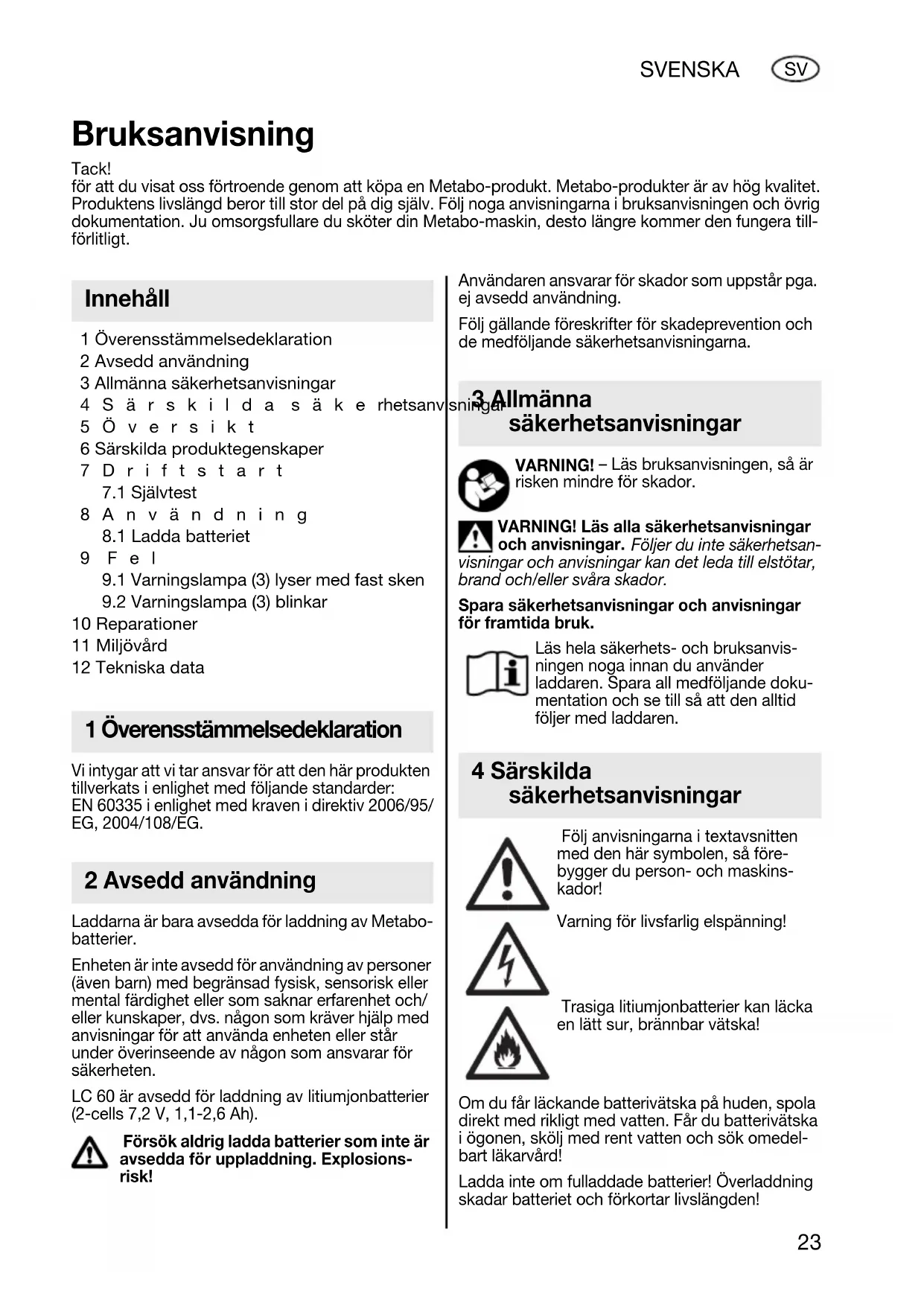 10 Reparationer 11 Miljövård 12 Tekniska data Vi intygar att vi tar ansvar för att den här produkten tillverkats i enlighet med följande standarder: EN 60335 i enlighet med kraven i direktiv 2006/95/ EG, 2004/108/EG. Laddarna är bara avsedda för laddning av Metabo- batterier. Enheten är inte avsedd för användning av personer (även barn) med begränsad fysisk, sensorisk eller mental färdighet eller som saknar erfarenhet och/ eller kunskaper, dvs. någon som kräver hjälp med anvisningar för att använda enheten eller står under överinseende av någon som ansvarar för säkerheten. LC 60 är avsedd för laddning av litiumjonbatterier (2-cells 7,2 V, 1,1-2,6 Ah). Försök aldrig ladda batterier som inte är avsedda för uppladdning. Explosions- risk! Användaren ansvarar för skador som uppstår pga. ej avsedd användning. Följ gällande föreskrifter för skadeprevention och de medföljande säkerhetsanvisningarna. VARNING! – Läs bruksanvisningen, så är risken mindre för skador. VARNING! Läs alla säkerhetsanvisningar och anvisningar. Följer du inte säkerhetsan- visningar och anvisningar kan det leda till elstötar, brand och/eller svåra skador. Spara säkerhetsanvisningar och anvisningar för framtida bruk. Läs hela säkerhets- och bruksanvis- ningen noga innan du använder laddaren. Spara all medföljande doku- mentation och se till så att den alltid följer med laddaren. Följ anvisningarna i textavsnitten med den här symbolen, så före- bygger du person- och maskins- kador! Varning för livsfarlig elspänning! Trasiga litiumjonbatterier kan läcka en lätt sur, brännbar vätska! Om du får läckande batterivätska på huden, spola direkt med rikligt med vatten. Får du batterivätska i ögonen, skölj med rent vatten och sök omedel- bart läkarvård! Ladda inte om fulladdade batterier! Överladdning skadar batteriet och förkortar livslängden! Bruksanvisning Tack! för att du visat oss förtroende genom att köpa en Metabo-produkt. Metabo-produkter är av hög kvalitet. Produktens livslängd beror till stor del på dig själv. Följ noga anvisningarna i bruksanvisningen och övrig dokumentation. Ju omsorgsfullare du sköter din Metabo-maskin, desto längre kommer den fungera till- förlitligt. Innehåll 1 Överensstämmelsedeklaration 2 Avsedd användning 3 Allmänna säkerhetsanvisningar 4 Särskilda säkerhetsanvisningar24 SVENSKA