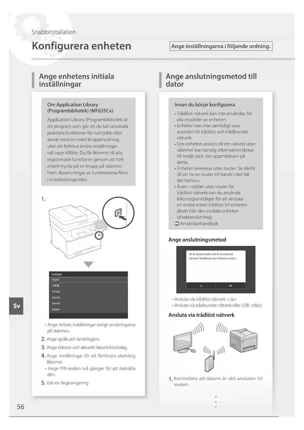 Konfigurera enheten Ange enhetens initiala inställningar Ange inställningarna i följande ordning. Snabbinstallation SvSvMer information nns i "Installera med hjälp av installationsguiden" i användarhandboken Kontrollera datorns nätverksinställningar. Anteckna SSID och nätverksnyckeln.• Kontrollera etiketten på routern. Användarhandbok• Det är lättare att göra inställningarna om routern är märkt med WPS. Användarhandbok Ange åtkomstpunkt och nätverksnyckel enligt anvisningarna på skärmen.1. Tryck på <OK>.2. Tryck på <SSID-inställningar>.3. Tryck på <Välj åtkomstpunkt>.4. Välj åtkomstpunkt (SSID) och tryck på <Nästa>.5. Ange en WEP-nyckel (nätverksnyckel) och tryck på <Använd>.6. Tryck på <Ja>.• IP-adressen konfigureras automatiskt inom några minuter.• "Ansluten." visas. Installera drivrutin och programvara. "Installera programvara" på sidan 58Du är nu klar med enhetens initiala inställningar.Fortsätt med att ange faxinställningar om enheten har faxfunktion. Sidan 59 Ansluta via trådbundet nätverk Nätverkskabel medföljer inte den här enheten.Se till att det finns en till hands om det behövs. Kontrollera att datorn är rätt ansluten till routern. Kontrollera datorns nätverksinställningar. Anslut nätverkskabeln.• Vänta några minuter efter att du har anslutit kabeln (tills IP-adressen anges automatiskt).• Om en statisk IP-adress har angetts på datorn anger du enhetens IP-adress manuellt. Installera drivrutin och programvara. "Installera programvara" på sidan 58Du är nu klar med enhetens initiala inställningar.Fortsätt med att ange faxinställningar om enheten har faxfunktion. Sidan 59