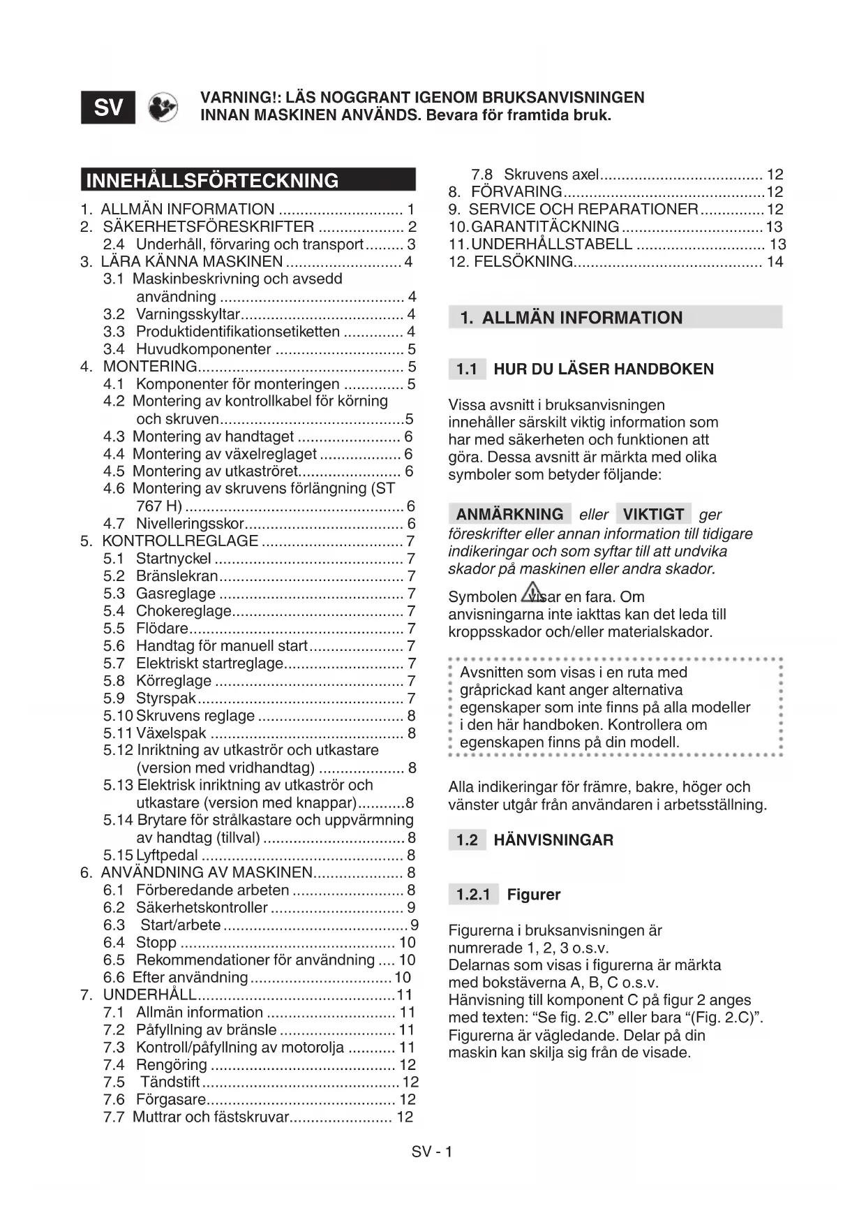 - Kontrollera att det inte nns lösa eller skadade delar. Byt ut skadadeSV - 11 komponenter om det krävs och dra eventuellt åt lösa skruvar och bultar. Täck inte över maskinen när motor och ljuddämpare fortfarande är varma.