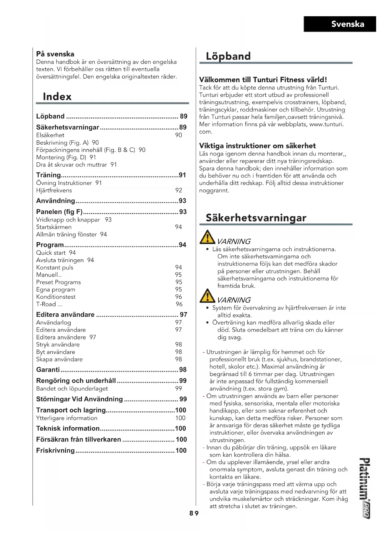 - System för övervakning av hjärtfrekvensen är inte alltid exakta. • Överträning kan medföra allvarlig skada eller död. Sluta omedelbart att träna om du känner dig svag. - Utrustningen är lämplig för hemmet och för professionellt bruk (t.ex. sjukhus, brandstationer, hotell, skolor etc.). Maximal användning är begränsad till 6 timmar per dag. Utrustningen är inte anpassad för fullständig kommersiell användning (t.ex. stora gym). - Om utrustningen används av barn eller personer med fysiska, sensoriska, mentala eller motoriska handikapp, eller som saknar erfarenhet och kunskap, kan detta medföra risker. Personer som är ansvariga för deras säkerhet måste ge tydliga instruktioner, eller övervaka användningen av utrustningen. - Innan du påbörjar din träning, uppsök en läkare som kan kontrollera din hälsa. - Om du upplever illamående, yrsel eller andra onormala symptom, avsluta genast din träning och kontakta en läkare. - Börja varje träningspass med att värma upp och avsluta varje träningspass med nedvarvning för att undvika muskelsmärtor och sträckningar. Kom ihåg att stretcha i slutet av träningen. På svenska Denna handbok är en översättning av den engelska texten. Vi förbehåller oss rätten till eventuella översättningsfel. Den engelska originaltexten råder. Index Löpband ............................................................ 89 Säkerhetsvarningar .......................................... 89 Elsäkerhet 90Beskrivning (Fig. A) 90Förpackningens innehåll (Fig. B & C) 90Montering (Fig. D) 91Dra åt skruvar och muttrar 91 Träning ...............................................................91 Övning Instruktioner 91Hjärtfrekvens 92 Användning ....................................................... 93 Panelen (g F) ................................................... 93 Vridknapp och knappar 93Startskärmen 94Allmän träning fönster 94 Program ............................................................. 94 Quick start 94Avsluta träningen 94Konstant puls 94Manuell .. 95Preset Programs 95Egna program 95Konditionstest 96T-Road ... 96 Editera användare ............................................ 97 Användarlog 97Editera användare 97Editera användere 97Stryk användare 98Byt användare 98Skapa användare 98 Garanti ............................................................... 98 Rengöring och underhåll ................................. 99 Bandet och löpunderlaget 99 Störningar Vid Användning ............................. 99 Transport och lagring .....................................100 Ytterligare information 100 Teknisk information ........................................ 100 Försäkran från tillverkaren ............................ 100 Friskrivning ..................................................... 10090 Svenska - Utrustningen är endast anpassad för användning inomhus. Utrustningen är inte anpassad för användning utomhus. - Använd endast utrustningen i miljöer med god ventilation. Använd inte utrustningen i dragiga miljöer för att undvika att bli förkyld. - Använd endast utrustningen i miljöer med temperatur mellan 10 °C och 35 °C. Förvara endast utrustningen i miljöer med temperatur mellan 5 °C och 45 °C. - Använd inte och förvara inte utrustningen i fuktig miljö. Luftfuktigheten får aldrig överstiga 80%. - Använd endast utrustningen för dess avsedda ändamål. Använd inte utrustningen för andra ändamål än de som beskrivs i handboken. - Använd inte den här utrustningen om någon del är trasig eller skadad. Om någon del är trasig eller skadad, kontakta din återförsäljare. - Håll undan händer, fötter och andra kroppsdelar från de rörliga delarna. - Håll undan håret från de rörliga delarna. - Bär passande kläder och skor. - Håll undan kläder, smycken och andra föremål från de rörliga delarna. - Låt bara en person åt gången använda utrustningen. Utrustningen får inte användas av personer som väger mer än 165 kg (363 lbs). - Öppna inte utrustningen utan att kontakta din återförsäljare. Elsäkerhet (endast elektrisk utrustning) - Före användning, kontrollera alltid att nätspänningen är densamma som spänningen på utrustningens märkplåt. - Använd inte en förlängningssladd. - Håll strömkabeln borta från värme, olja och vassa kanter. - Ändra inte strömkabeln eller kontakten. - Använd inte utrustningen om strömkabeln eller kontakten är trasig eller skadad. Om strömkabeln eller kontakten är trasig eller skadad, kontakta din återförsäljare. - Rulla alltid ut strömkabeln helt. - Dra inte strömkabeln under utrustningen. Dra inte strömkabeln under en matta. Placera inte några föremål på strömkabeln. - Kontrollera att strömkabeln inte hänger över en bordskant. Kontrollera att strömkabeln inte kan kommas åt avsiktligen eller snubblas över. - Lämna inte utrustningen obevakad med kontakten instoppad i vägguttaget. - Dra inte i strömkabeln för att avlägsna kontakten från vägguttaget. - Avlägsna stickkontakten från vägguttaget när utrustningen inte används, innan den monteras eller monteras isär och innan den rengörs eller underhålls. VARNING