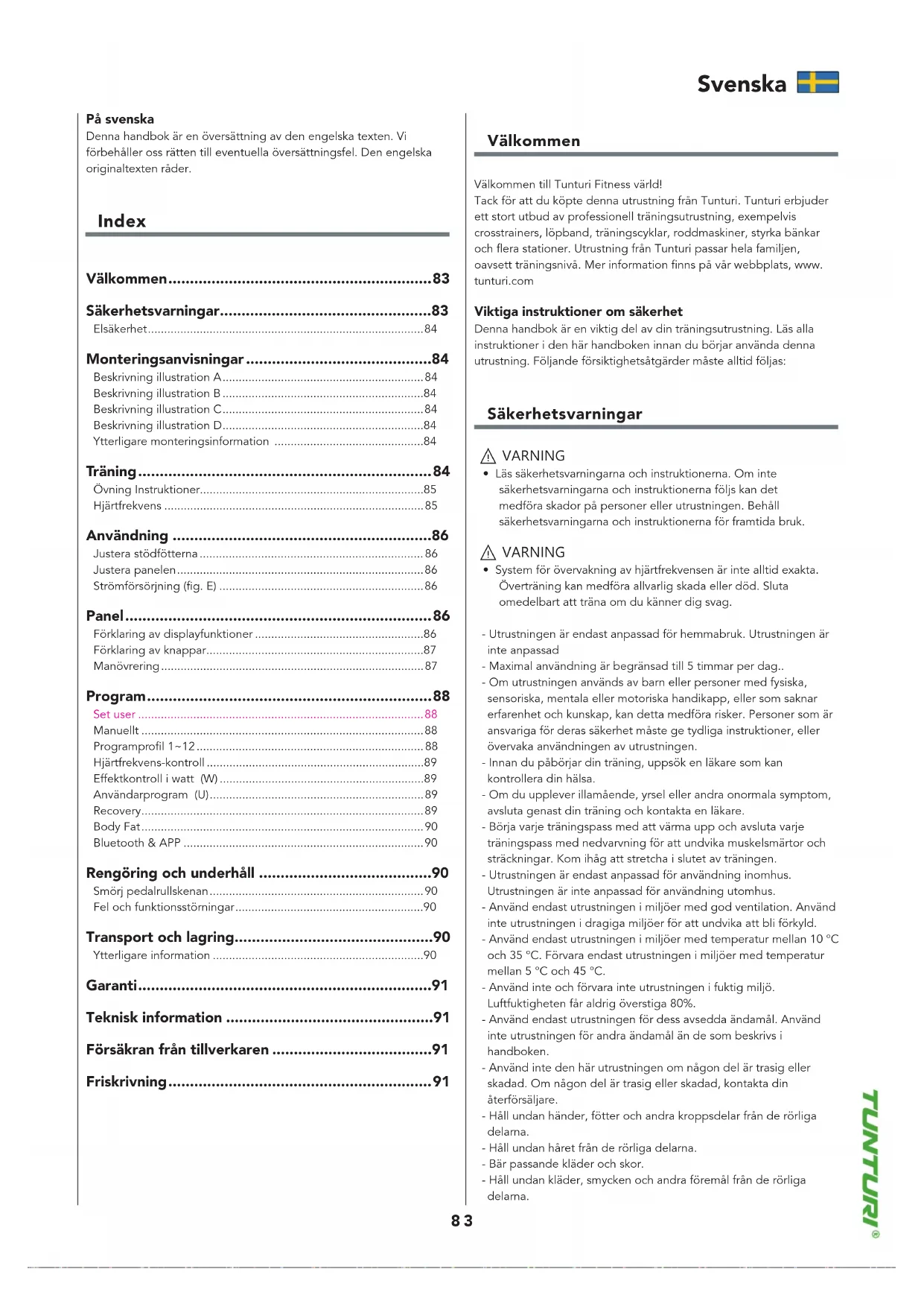 - Para conocer las dimensiones del producto y las dimensiones funcionales, consulte la ilustración G Declaración del fabricante Tunturi New Fitness BV declara que el producto es conforme con las siguientes normas y directivas: EN 957 (HA), 2014/30/EU Por tanto, el producto dispone de marcado CE 04-2020 Tunturi New Fitness BV Purmerweg 1 1311 XE Almere The Netherlands Descargo de responsabilidad © 2020 Tunturi New Fitness BV Reservados todos los derechos - Tanto el producto como el manual están sujetos a modificaciones - Las modificaciones se pueden cambiar sin aviso - Consulte nuestra página web para descargar la versión del manual de usuario más reciente83 Svenska Välkommen 83 Säkerhetsvarningar 83 Elsäkerhet 84 Monteringsanvisningar 84 Beskrivning illustration A 84 Beskrivning illustration B 84 Beskrivning illustration C 84 Beskrivning illustration D 84Ytterligare monteringsinformation 84 Träning 84 Övning Instruktioner85 Hjärtfrekvens 85 Användning 86 Justera stödfötterna 86 Justera panelen 86 Strömförsörjning (g. E) 86 Panel 86 Förklaring av displayfunktioner 86Förklaring av knappar 87 Manövrering 87 Program 88 Set user 88 Manuellt 88 Programprol 1~12 88 Hjärtfrekvens-kontroll 89Effektkontroll i watt (W) 89 Användarprogram (U) 89 Recovery 89 Body Fat 90 Bluetooth & APP 90 Rengöring och underhåll 90 Smörj pedalrullskenan 90 Fel och funktionsstörningar 90 Transport och lagring90 Ytterligare information 90 Garanti 91 Teknisk information 91 Försäkran från tillverkaren 91 Friskrivning 91 På svenska Denna handbok är en översättning av den engelska texten Vi förbehåller oss rätten till eventuella översättningsfel Den engelska originaltexten råder Index Välkommen Välkommen till Tunturi Fitness värld!Tack för att du köpte denna utrustning från Tunturi Tunturi erbjuder ett stort utbud av professionell träningsutrustning, exempelvis crosstrainers, löpband, träningscyklar, roddmaskiner, styrka bänkar och flera stationer Utrustning från Tunturi passar hela familjen, oavsett träningsnivå Mer information finns på vår webbplats, wwwtunturicom Viktiga instruktioner om säkerhet Denna handbok är en viktig del av din träningsutrustning Läs alla instruktioner i den här handboken innan du börjar använda denna utrustning Följande försiktighetsåtgärder måste alltid följas: Säkerhetsvarningar ⚠ VARNING
