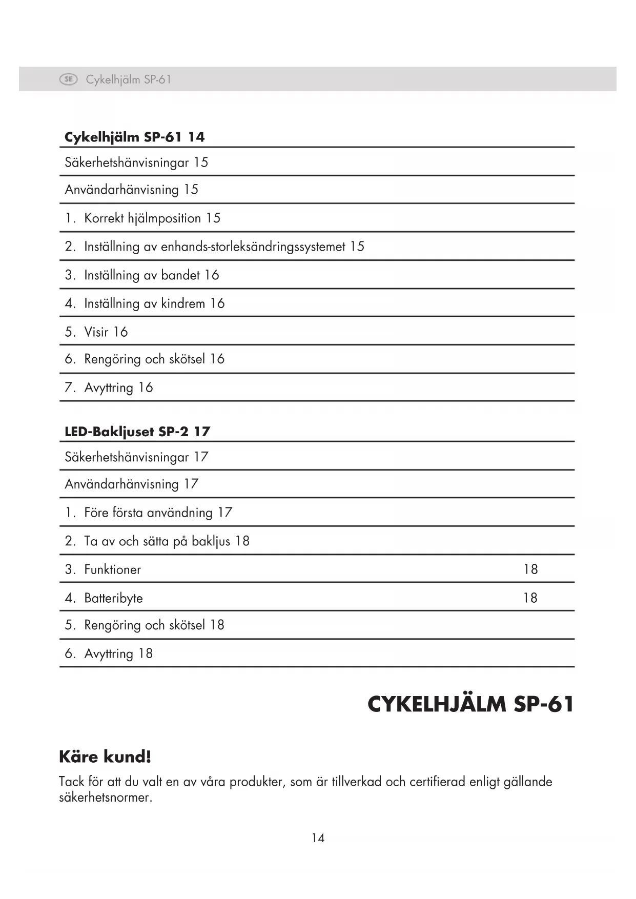 Käre kund! Tack för att du valt en av våra produkter, som är tillverkad och certierad enligt gällande säkerhetsnormer. Cykelhjälm SP-61 14 Säkerhetshänvisningar 15 Användarhänvisning 15