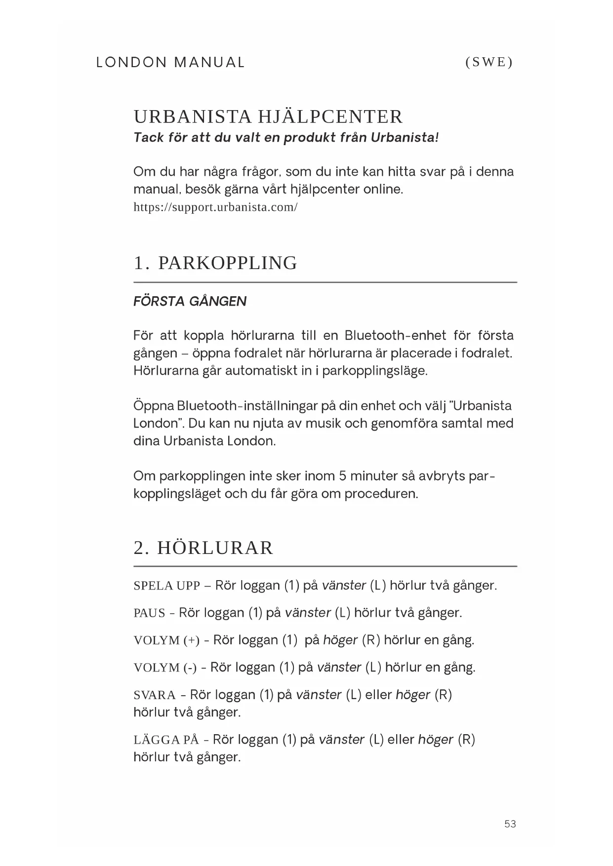 Tack för att du valt en produkt från Urbanista! Om du har några frågor, som du inte kan hitta svar på i denna manual, besök gärna vårt hjälpcenter online. https://support.urbanista.com/ (SWE)54