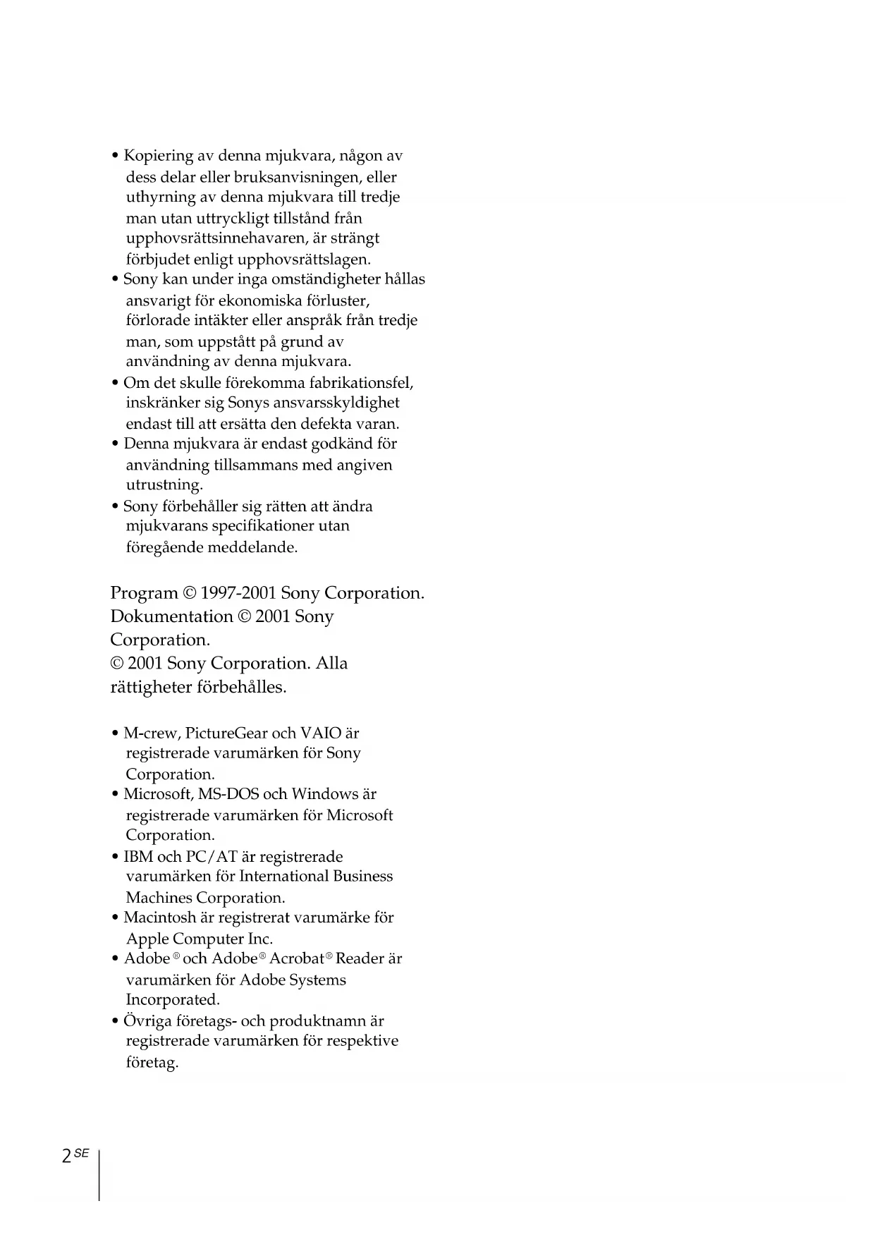 - Sony förbehåller sig rätten att ändra mjukvarans specifikationer utan föregående meddelande. Program © 1997-2001 Sony Corporation. Dokumentation © 2001 Sony Corporation. © 2001 Sony Corporation. Alla rättigheter förbehålles.