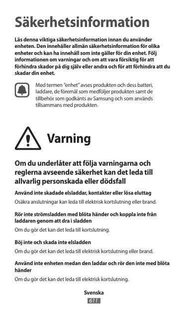 Säkerhetsinformation Läs denna viktiga säkerhetsinformation innan du använder enheten. Den innehåller allmän säkerhetsinformation för olika enheter och kan ha innehåll som inte gäller för din enhet. Följ informationen om varningar och om att vara försiktig för att förhindra skador på dig själv eller andra och för att förhindra att du skadar din enhet. Med termen ”enhet” avses produkten och dess batteri, laddare, de föremål som medföljer produkten samt de tillbehör som godkänts av Samsung och som används tillsammans med produkten. Varning Om du underlåter att följa varningarna och reglerna avseende säkerhet kan det leda till allvarlig personskada eller dödsfall Använd inte skadade elsladdar, kontakter eller lösa eluttag Osäkra anslutningar kan leda till elektrisk kortslutning eller brand. Rör inte strömsladden med blöta händer och koppla inte från laddaren genom att dra i sladden Om du gör det kan det leda till kortslutning. Böj inte och skada inte elsladden Om du gör det kan det leda till elektrisk kortslutning eller brand. Använd inte enheten medan den laddar och rör den inte med blöta händer Om du gör det kan det leda till elektrisk kortslutning. Svenska