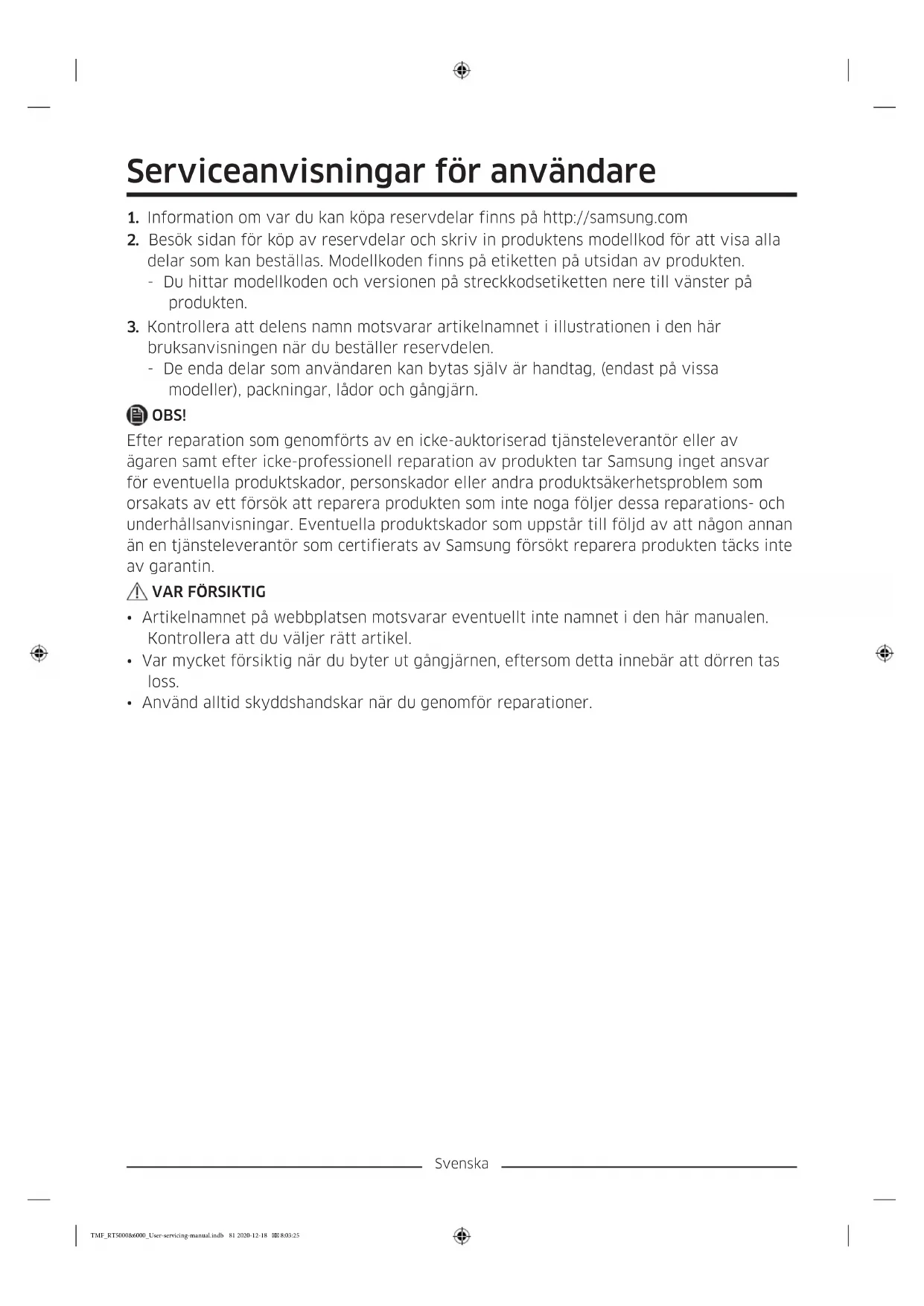 bruksanvisningen när du beställer reservdelen. - De enda delar som användaren kan bytas själv är handtag, (endast på vissa modeller), packningar, lådor och gångjärn. OBS! Efter reparation som genomförts av en icke-auktoriserad tjänsteleverantör eller av ägaren samt efter icke-professionell reparation av produkten tar Samsung inget ansvar för eventuella produktskador, personskador eller andra produktsäkerhetsproblem som orsakats av ett försök att reparera produkten som inte noga följer dessa reparations- och underhållsanvisningar. Eventuella produktskador som uppstår till följd av att någon annan än en tjänsteleverantör som certifierats av Samsung försökt reparera produkten täcks inte av garantin.