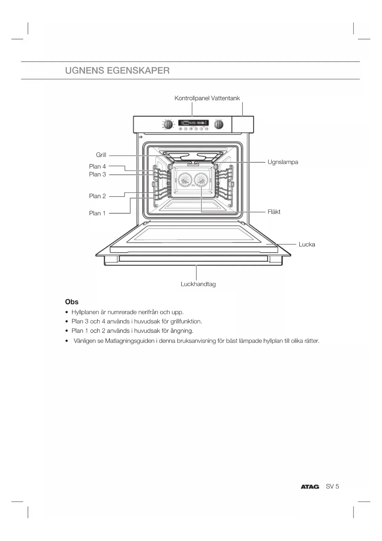 - Vänligen se Matlagningsguiden i denna bruksanvisning för bäst lämpade hyllplan till olika rätter. UGNENS EGENSKAPER Kontrollpanel Vattentank Ugnslampa Fläkt Grill Plan 4 Plan 3 Plan 2 Plan 1 Luckhandtag LuckaSV 6 TILLBEHÖR Följande tillbehör medföljer din kombi ångugn: