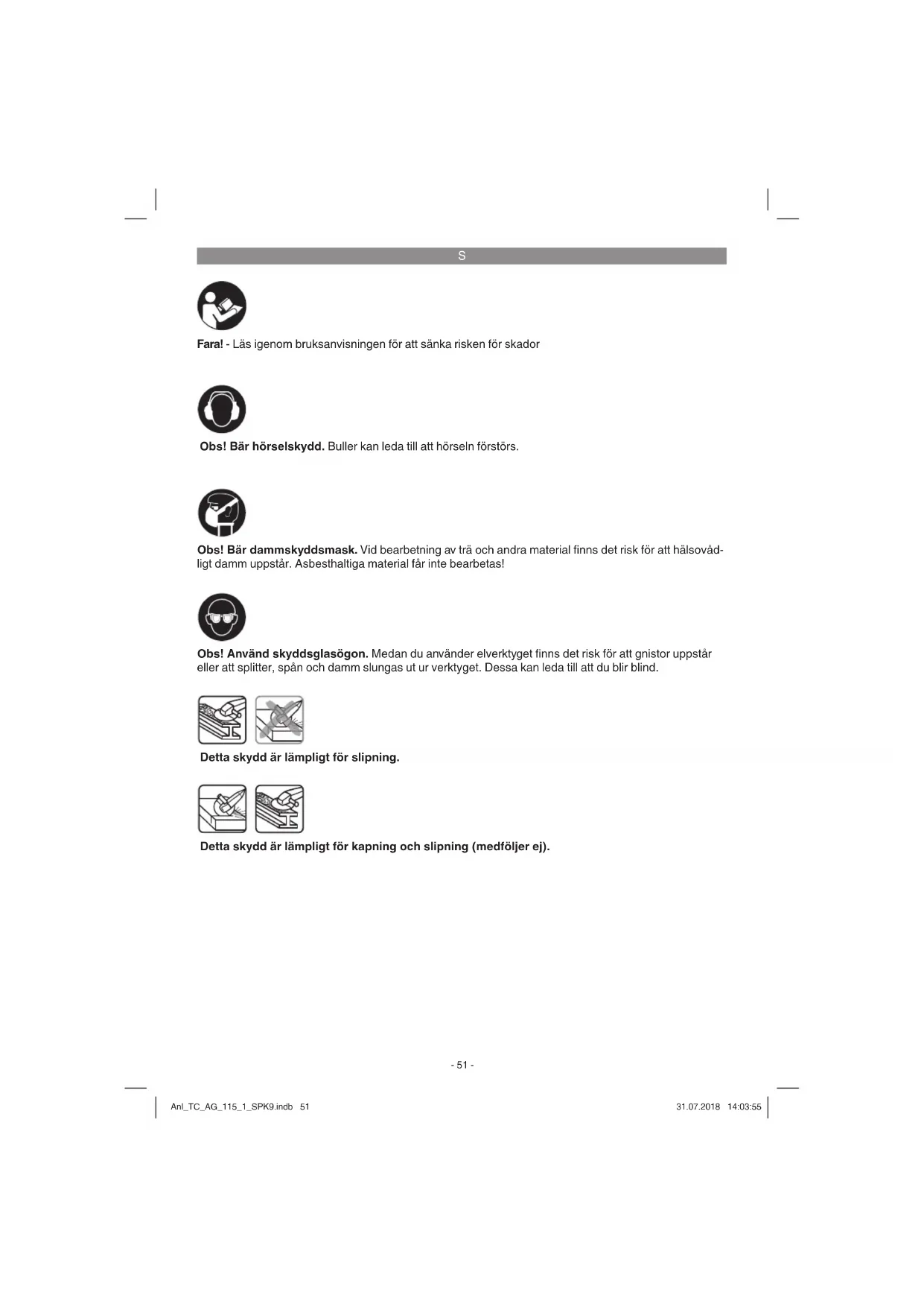 Fara! - Läs igenom bruksanvisningen för att sänka risken för skador Obs! Bär hörselskydd. Buller kan leda till att hörseln förstörs. Obs! Använd skyddsglasögon. Medan du använder elverktyget fi nns det risk för att gnistor uppstår eller att splitter, spån och damm slungas ut ur verktyget. Dessa kan leda till att du blir blind. Obs! Bär dammskyddsmask. Vid bearbetning av trä och andra material fi nns det risk för att hälsovåd- ligt damm uppstår. Asbesthaltiga material får inte bearbetas! Detta skydd är lämpligt för slipning. Detta skydd är lämpligt för kapning och slipning (medföljer ej). Anl_TC_AG_115_1_SPK9.indb 51Anl_TC_AG_115_1_SPK9.indb 51 31.07.2018 14:03:5531.07.2018 14:03:55S