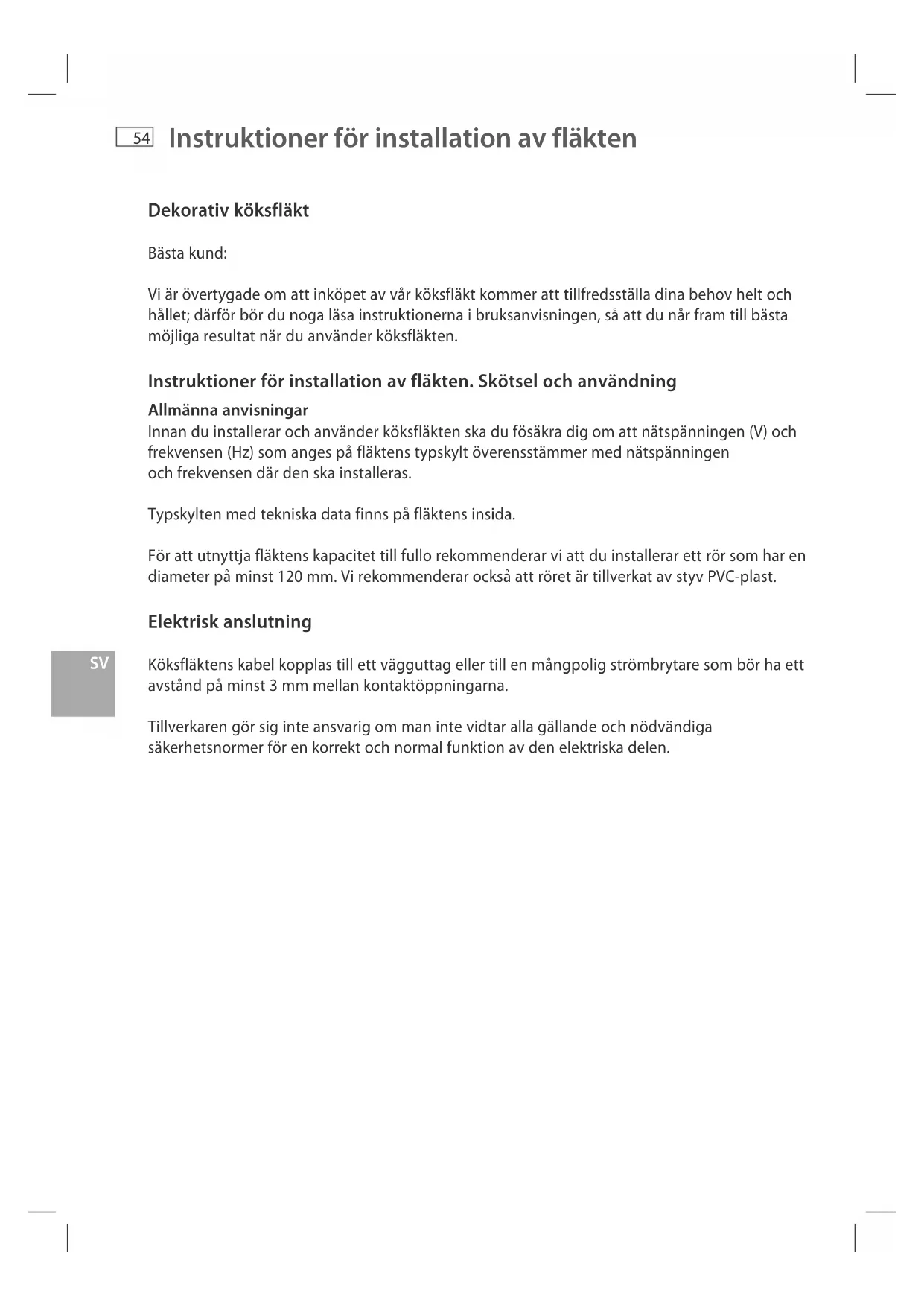 Instruktioner för installation av fläkten Dekorativ köksfläkt Bästa kund: Vi är övertygade om att inköpet av vår köksfläkt kommer att tillfredsställa dina behov helt och hållet; därför bör du noga läsa instruktionerna i bruksanvisningen, så att du når fram till bästa möjliga resultat när du använder köksfläkten. Instruktioner för installation av fläkten. Skötsel och användning Allmänna anvisningar Innan du installerar och använder köksfläkten ska du fösäkra dig om att nätspänningen (V) och frekvensen (Hz) som anges på fläktens typskylt överensstämmer med nätspänningen och frekvensen där den ska installeras. Typskylten med tekniska data finns på fläktens insida. För att utnyttja fläktens kapacitet till fullo rekommenderar vi att du installerar ett rör som har en diameter på minst 120 mm. Vi rekommenderar också att röret är tillverkat av styv PVC-plast. Elektrisk anslutning Köksfläktens kabel kopplas till ett vägguttag eller till en mångpolig strömbrytare som bör ha ett avstånd på minst 3 mm mellan kontaktöppningarna. Tillverkaren gör sig inte ansvarig om man inte vidtar alla gällande och nödvändiga säkerhetsnormer för en korrekt och normal funktion av den elektriska delen.55