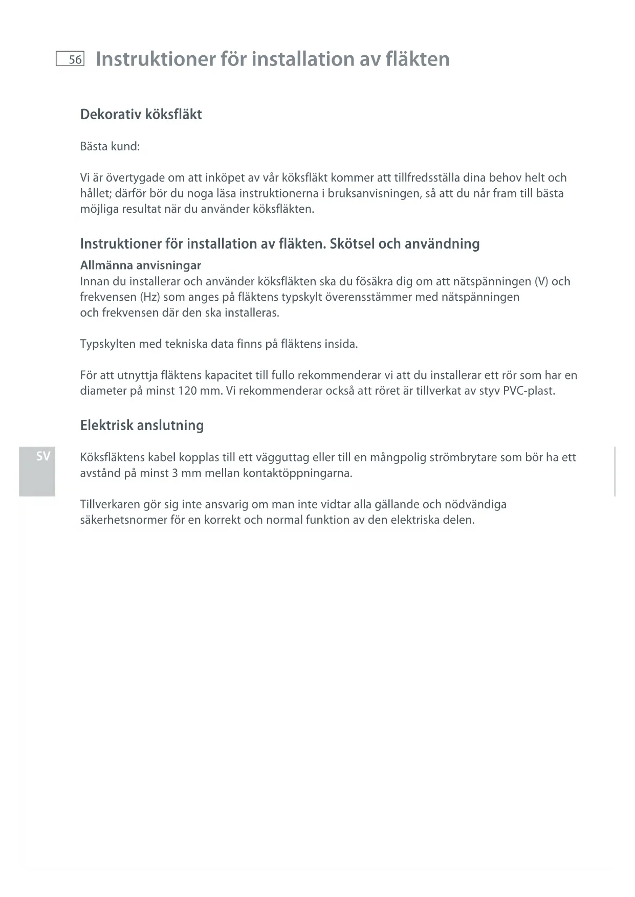 Instruktioner för installation av fläkten Dekorativ köksfläkt Bästa kund: Vi är övertygade om att inköpet av vår köksfläkt kommer att tillfredsställa dina behov helt och hållet; därför bör du noga läsa instruktionerna i bruksanvisningen, så att du når fram till bästa möjliga resultat när du använder köksfläkten. Instruktioner för installation av fläkten. Skötsel och användning Allmänna anvisningar Innan du installerar och använder köksfläkten ska du fösäkra dig om att nätspänningen (V) och frekvensen (Hz) som anges på fläktens typskylt överensstämmer med nätspänningen och frekvensen där den ska installeras. Typskylten med tekniska data finns på fläktens insida. För att utnyttja fläktens kapacitet till fullo rekommenderar vi att du installerar ett rör som har en diameter på minst 120 mm. Vi rekommenderar också att röret är tillverkat av styv PVC-plast. Elektrisk anslutning Köksfläktens kabel kopplas till ett vägguttag eller till en mångpolig strömbrytare som bör ha ett avstånd på minst 3 mm mellan kontaktöppningarna. Tillverkaren gör sig inte ansvarig om man inte vidtar alla gällande och nödvändiga säkerhetsnormer för en korrekt och normal funktion av den elektriska delen.57