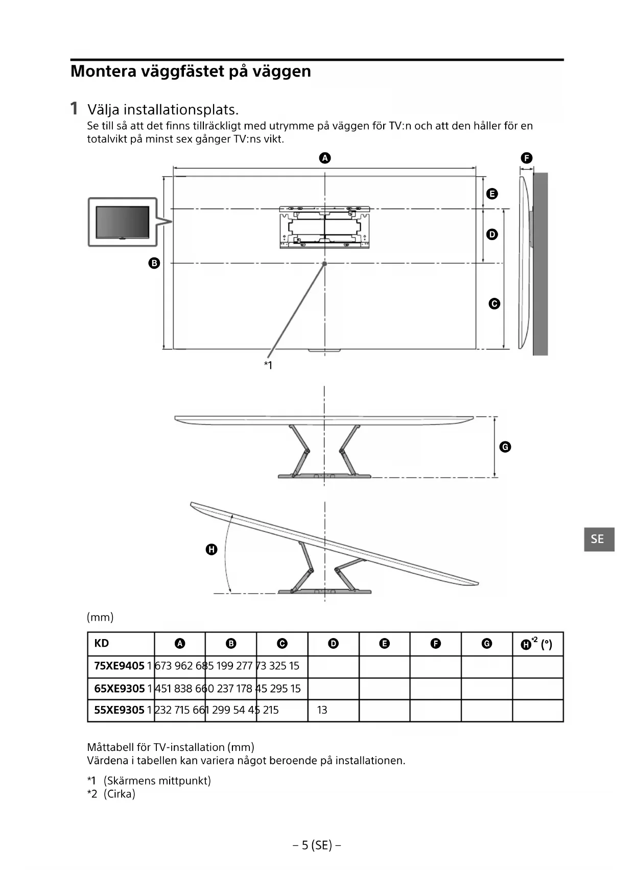 75XE9405 1 673 962 685 199 277 73 325 15 65XE9305 1 451 838 660 237 178 45 295 15 55XE9305 1 232 715 661 299 54 45 215 13 Måttabell för TV-installation (mm) Värdena i tabellen kan variera något beroende på installationen. *1 (Skärmens mittpunkt) *2 (Cirka)− 6 (SE) − Anmärkning