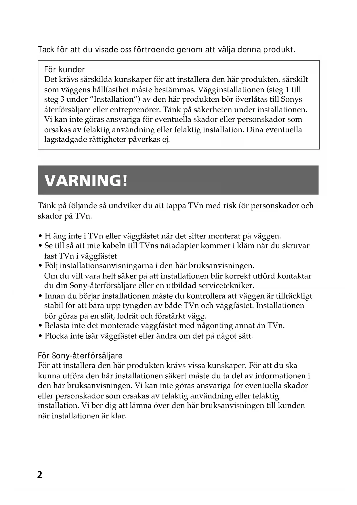 - Plocka inte isär väggfästet eller ändra om det på något sätt. För Sony-återförsäljare För att installera den här produkten krävs vissa kunskaper. För att du ska kunna utföra den här installationen säkert måste du ta del av informationen i den här bruksanvisningen. Vi kan inte göras ansvariga för eventuella skador eller personskador som orsakas av felaktig användning eller felaktig installation. Vi ber dig att lämna över den här bruksanvisningen till kunden när installationen är klar.3 Se upp!