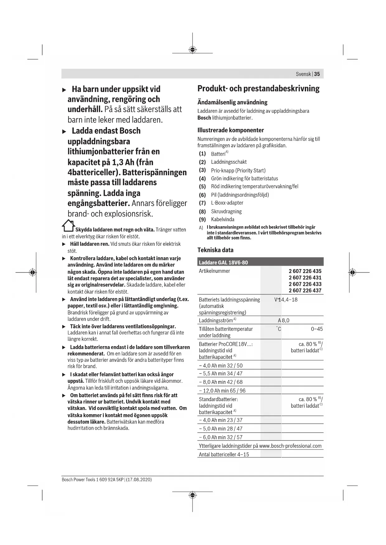 I bruksanvisningen avbildat och beskrivet tillbehör ingår inte i standardleveransen. I vårt tillbehörsprogram beskrivs allt tillbehör som finns. Tekniska data Laddare GAL 18V6-80 Artikelnummer