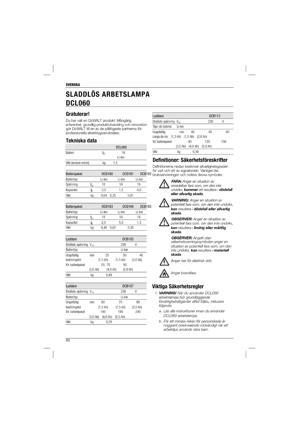 Viktiga Säkerhetsinstruktioner för alla Batteriladdare SPARA DESSA INSTRUKTIONER: Denna manual innehåller viktiga säkerhets- och driftinstruktioner för DCB105, DCB107 och DCB112 batteriladdare.