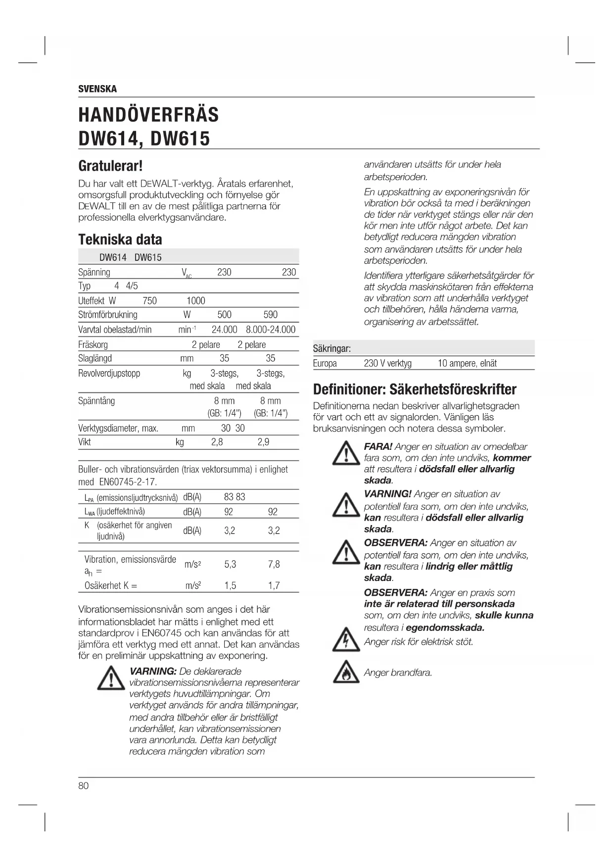 Din DEWALT högpresterande fräsmaskin DW614/ DW615 har konstruerats för professionell krävande fräsning. FÅR INTE ANVÄNDAS i fuktiga miljöer, eller i närheten av lättantändliga vätskor eller gaser. Denna överfräs är ett professionellt elverktyg. TILLÅT INTE barn att komma i kontakt med verktyget. Övervakning krävs då detta verktyg används av oerfarna personer.