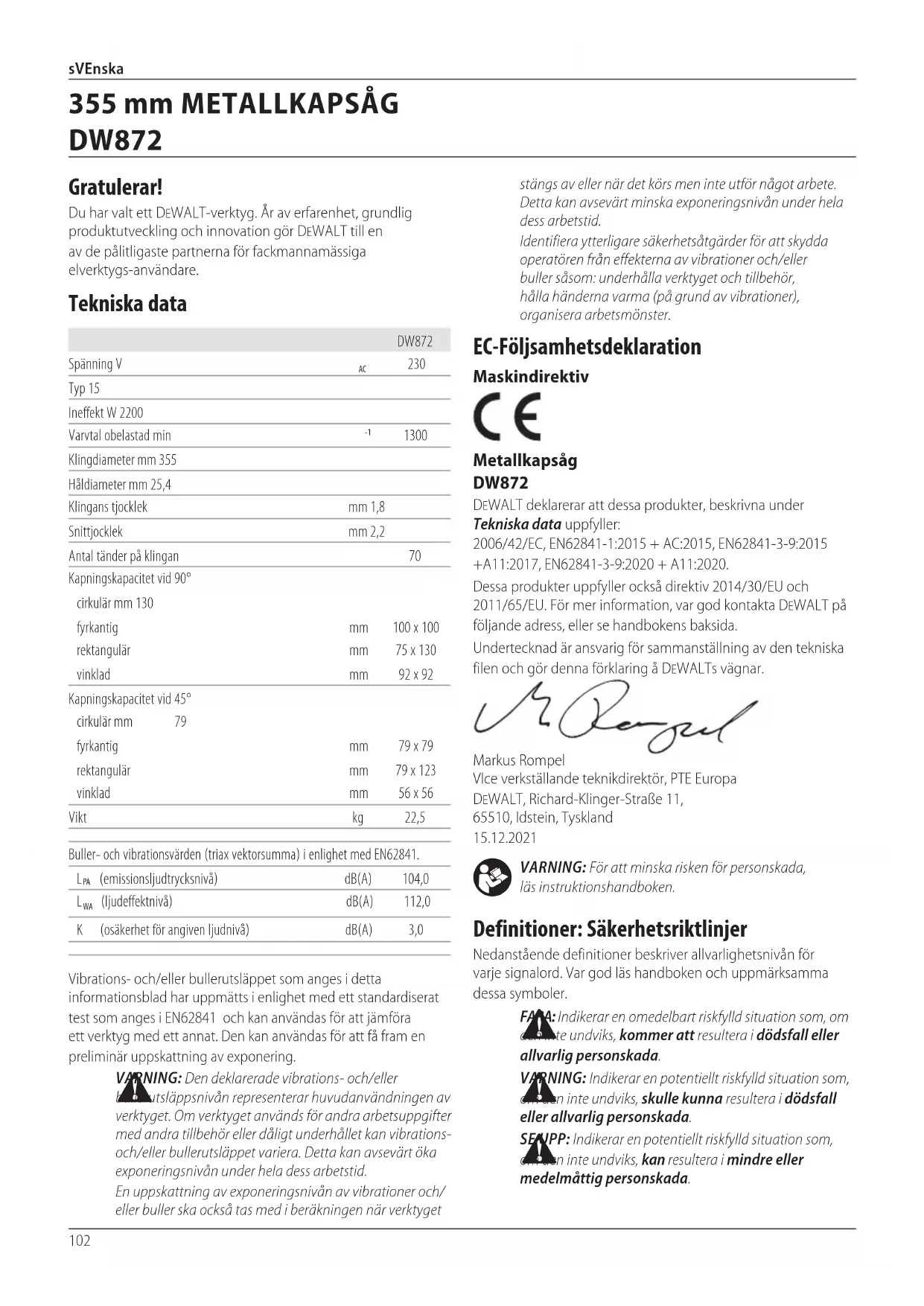 VAROITUS: Muita kuin DeWALT-lisävarusteita ei ole testattu tämän työkalun kanssa, joten niiden käyttäminen voi olla vaarallista. Käytä tämän laitteen kanssa vain DeWALTin suosittelemia varusteita vahingoittumisvaaranvähentämiseksi. Saat lisätietojajälleenmyyjältäsi. Ympäristön suojeleminen Erilliskeräys. Tuotteita ja akkuja, joissa on tämä merkintä, ei saa hävittää tavallisen kotitalousjätteenmukana. Tuotteet ja akut sisältävät materiaaleja, jotka voidaan kerätä tai kierrättää uudelleen käyttöä varten. Kierrätä sähkölaitteet ja akut paikallisten määräyksien mukaisesti. Lisätietoa on saatavilla osoitteesta www.2helpU.com.102 sVEnskaICMLsfi_GEN_Congratulations_U_W.icmlfi_GEN_TechDataDW872_ChopSaw_W.icmlfi_GEN_NoiseAndVibration_U_W.icmlfi_GEN_DeclarationOfConformity_DW872_Chopsaw_W.icmlfi_SAF_SafetyDefinitions_U_W.icmlfi_SAF_GeneralSafety62841_U_W.icml VARNING: För att minska risken för personskada, läsinstruktionshandboken. Definitioner: Säkerhetsriktlinjer Nedanstående definitioner beskriver allvarlighetsnivån för varje signalord. Var god läs handboken och uppmärksamma dessasymboler. FARA: Indikerar en omedelbart riskfylld situation som, om den inte undviks, kommer att resultera i dödsfall eller allvarligpersonskada. VARNING: Indikerar en potentiellt riskfylld situation som, om den inte undviks, skulle kunna resultera i dödsfall eller allvarligpersonskada. SE UPP: Indikerar en potentiellt riskfylld situation som, om den inte undviks, kan resultera i mindre eller medelmåttigpersonskada. EC-Följsamhetsdeklaration Maskindirektiv Metallkapsåg DW872 DeWALT deklarerar att dessa produkter, beskrivna under Tekniska data uppfyller: 2006/42/EC, EN62841-1:2015 + AC:2015, EN62841-3-9:2015 +A11:2017, EN62841-3-9:2020 + A11:2020.Dessa produkter uppfyller också direktiv 2014/30/EU och 2011/65/EU. För mer information, var god kontakta DeWALT på följande adress, eller se handbokensbaksida.Undertecknad är ansvarig för sammanställning av den tekniska filen och gör denna förklaring å DeWALTsvägnar.Markus Rompel VIce verkställande teknikdirektör, PTE Europa DeWALT, Richard-Klinger-Straße 11, 65510, Idstein, Tyskland 15.12.2021Vibrations- och/eller bullerutsläppet som anges i detta informationsblad har uppmätts i enlighet med ett standardiserat test som anges i EN62841 och kan användas för att jämföra ett verktyg med ett annat. Den kan användas för att få fram en preliminär uppskattning avexponering. VARNING: Den deklarerade vibrations- och/eller bullerutsläppsnivån representerar huvudanvändningen av verktyget. Om verktyget används för andra arbetsuppgifter med andra tillbehör eller dåligt underhållet kan vibrations- och/eller bullerutsläppet variera. Detta kan avsevärt öka exponeringsnivån under hela dessarbetstid.En uppskattning av exponeringsnivån av vibrationer och/eller buller ska också tas med i beräkningen när verktyget DW872Spänning V