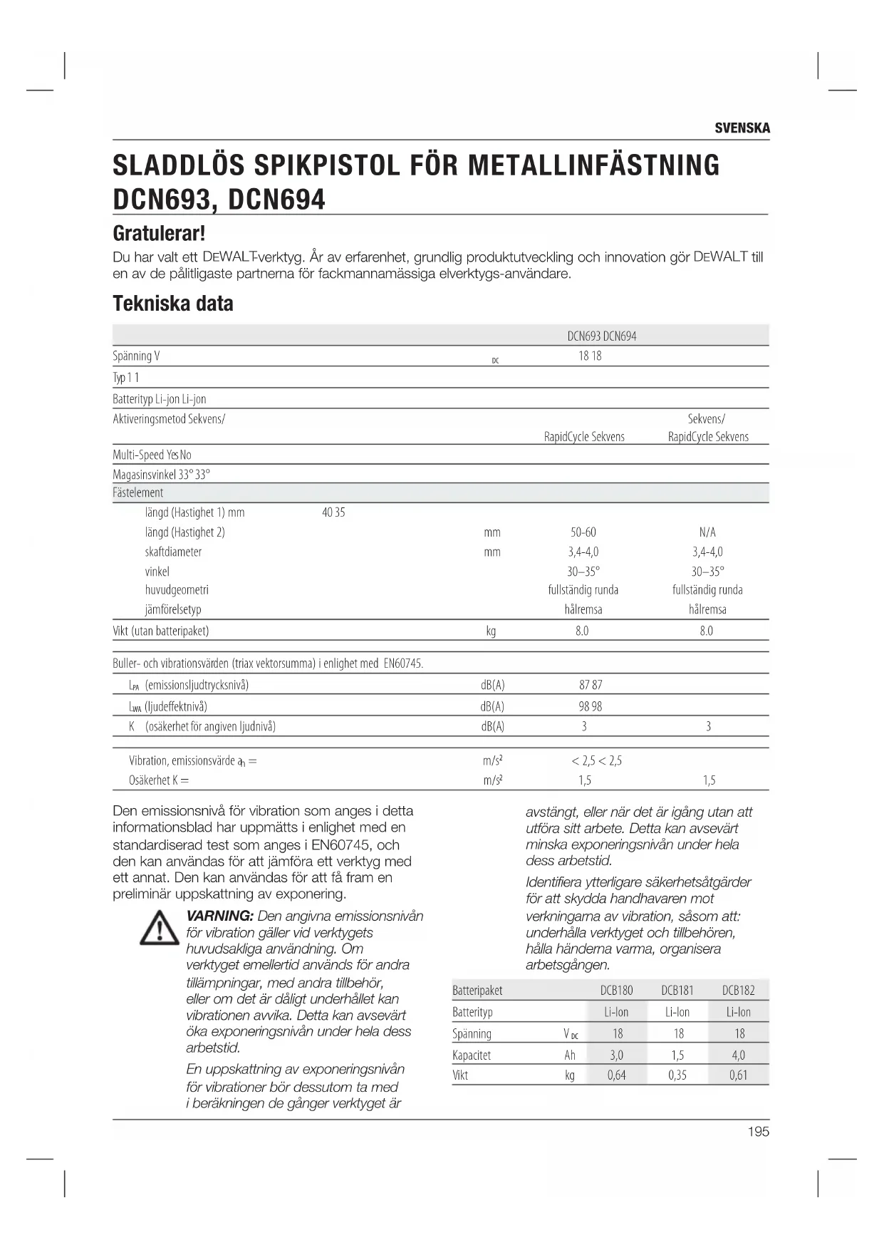 -korjauspalveluun.195 svenska Gratulerar! Du har valt ett DeWALT -verktyg. År av erfarenhet, grundlig produktutveckling och innovation gör DeWALT till en av de pålitligaste partnerna för fackmannamässiga elverktygs-användare. Tekniska data DCN693 DCN694 Spänning V