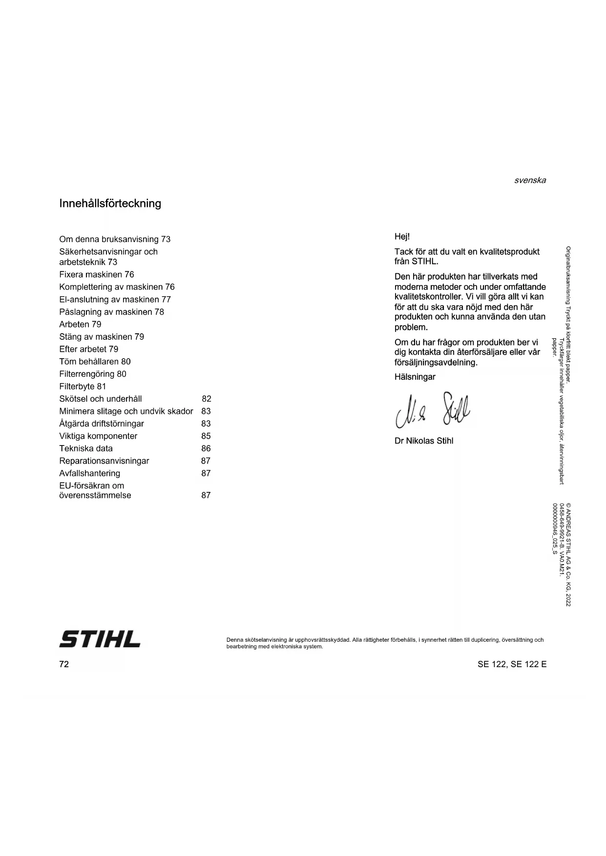 Denna skötselanvisning är upphovsrättsskyddad. Alla rättigheter förbehålls, i synnerhet rätten till duplicering, översättning och bearbetning med elektroniska system. Innehållsförteckning Hej! Tack för att du valt en kvalitetsprodukt från STIHL. Den här produkten har tillverkats med moderna metoder och under omfattande kvalitetskontroller. Vi vill göra allt vi kan för att du ska vara nöjd med den här produkten och kunna använda den utan problem. Om du har frågor om produkten ber vi dig kontakta din återförsäljare eller vår försäljningsavdelning. Hälsningar Dr Nikolas Stihl Om denna bruksanvisning 73 Säkerhetsanvisningar och arbetsteknik 73 Fixera maskinen 76 Komplettering av maskinen 76 El-anslutning av maskinen 77 Påslagning av maskinen 78 Arbeten 79 Stäng av maskinen 79 Efter arbetet 79 Töm behållaren 80 Filterrengöring 80 Filterbyte 81 Skötsel och underhåll 82 Minimera slitage och undvik skador 83 Åtgärda driftstörningar 83 Viktiga komponenter 85 Tekniska data 86 Reparationsanvisningar 87 Avfallshantering 87 EU-försäkran om överensstämmelse 87SE 122, SE 122 E svenska