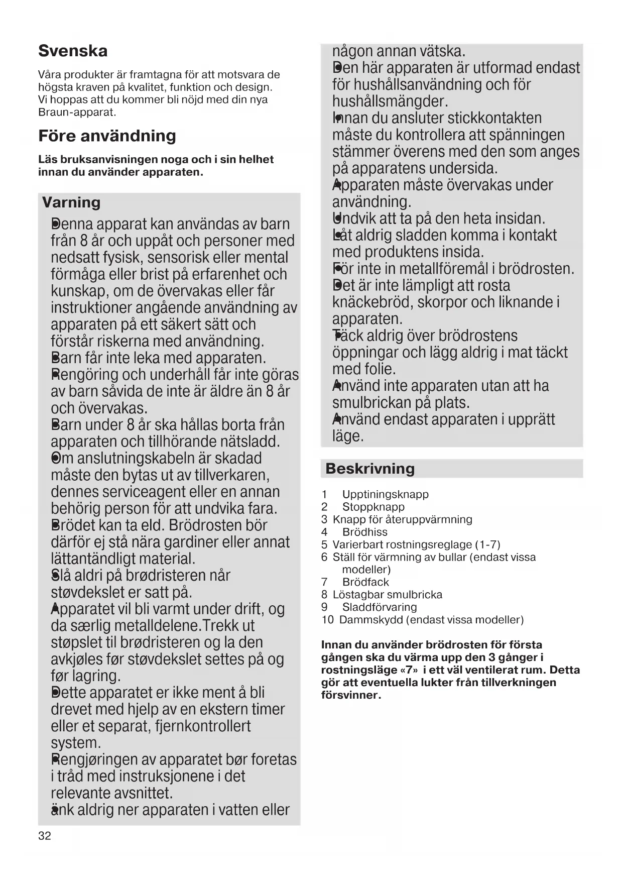 Använd endast apparaten i upprätt läge. Beskrivning 1 Upptiningsknapp 2 Stoppknapp 3 Knapp för återuppvärmning 4 Brödhiss 5 Varierbart rostningsreglage (1-7) 6 Ställ för värmning av bullar (endast vissa modeller) 7 Brödfack 8 Löstagbar smulbricka 9 Sladdförvaring 10 Dammskydd (endast vissa modeller) Innan du använder brödrosten för första gången ska du värma upp den 3 gånger i rostningsläge «7» i ett väl ventilerat rum. Detta gör att eventuella lukter från tillverkningen försvinner. 32Användning Du kan rosta bröd i alla storlekar som passar i brödfacket.