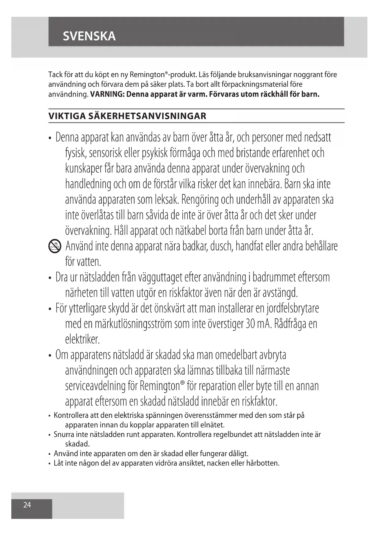 AE24 SVENSKA Tack för att du köpt en ny Remington®-produkt. Läs följande bruksanvisningar noggrant före användning och förvara dem på säker plats. Ta bort allt förpackningsmaterial före användning. VARNING: Denna apparat är varm. Förvaras utom räckhåll för barn.